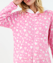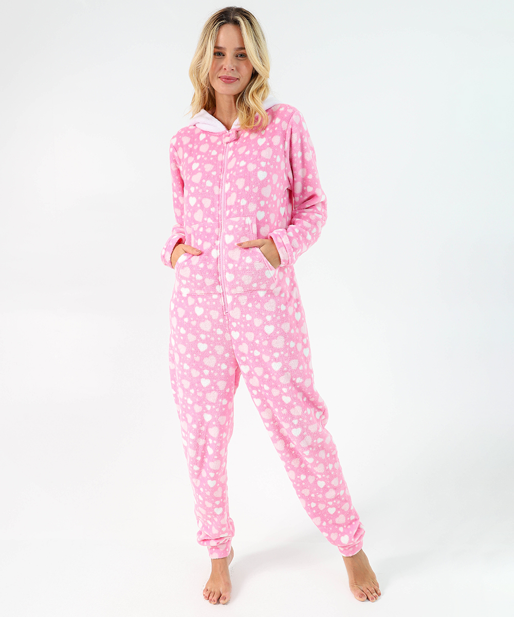 O macacão pijama feminino plush rosa é perfeito para quem busca conforto máximo com um toque fofo e estiloso. Com estampa de corações, traz um visual delicado ideal para momentos de descanso. Confeccionado em plush macio, proporciona toque aveludado e aquecimento na medida certa. Possui capuz, fechamento frontal com zíper e bolsos, garantindo praticidade e muito conforto para o dia a dia em casa.
