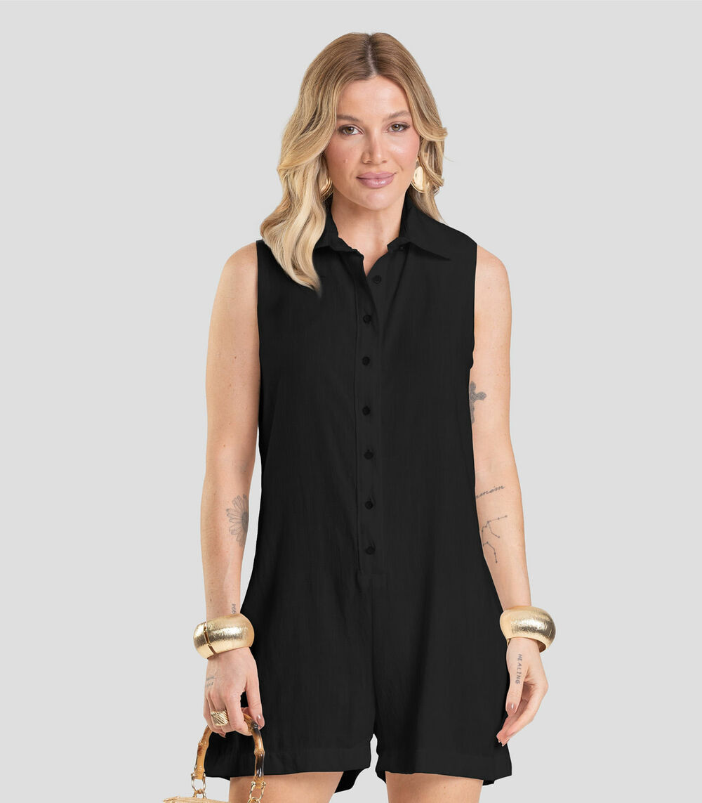 Macaquinho Feminino em Tecido Linho Dianna Preto