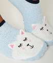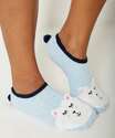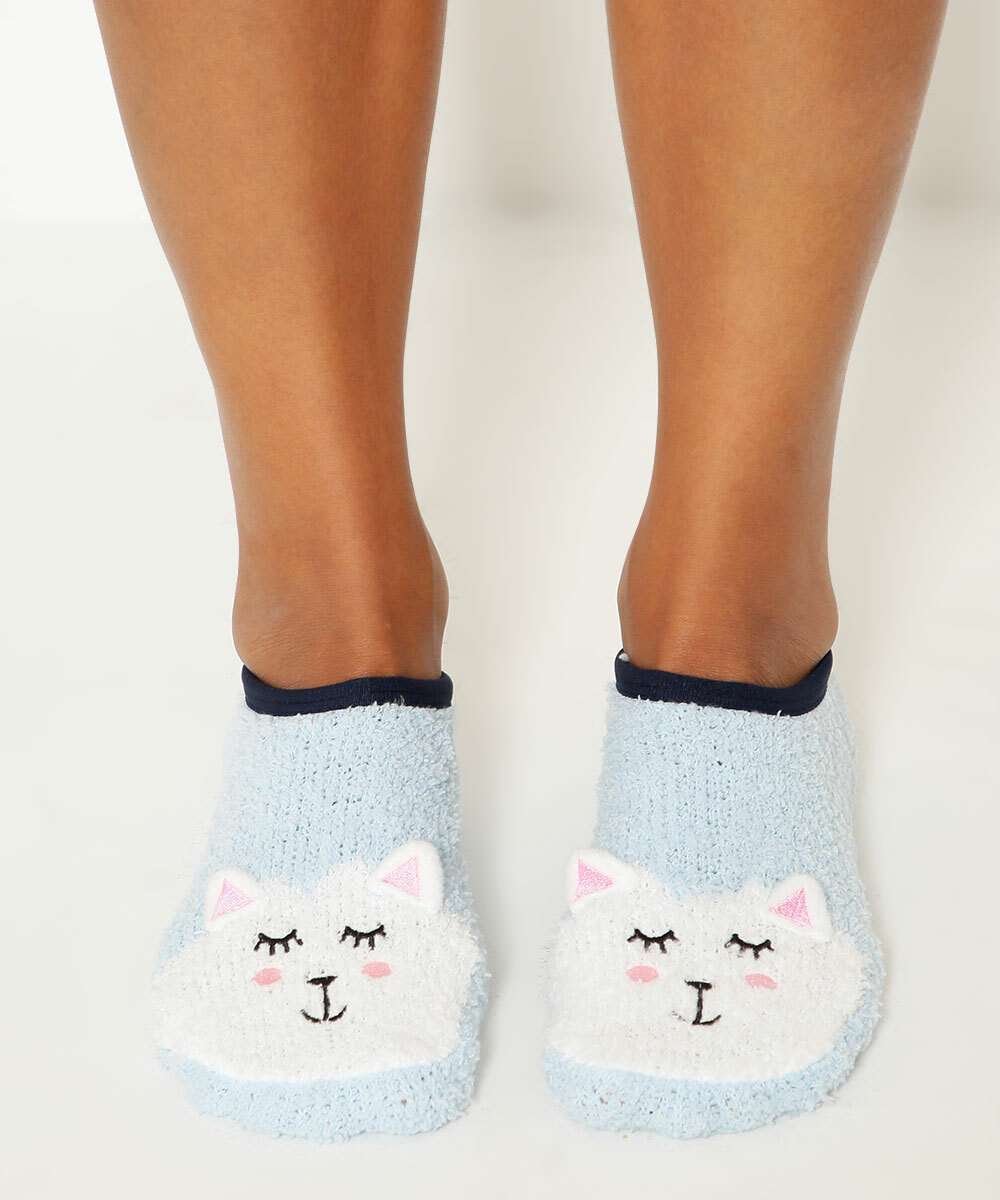 Meia feminina, modelo sapatilha, confeccionada em tecido chenille. Possui estampa gato, solado emborrachado antiderrapante, acabamento e costura no tom.
