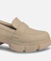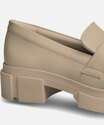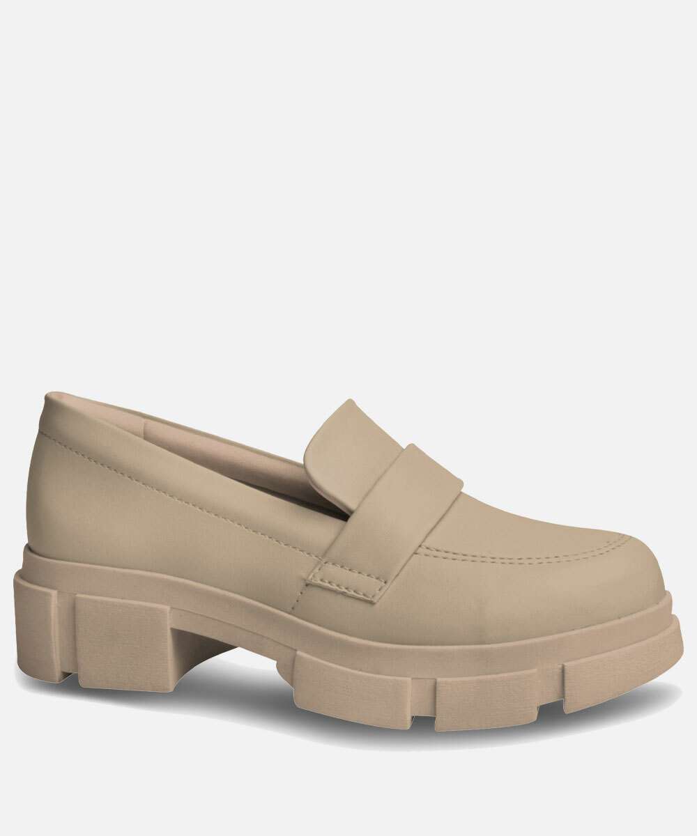 Mocassim feminino, confeccionado em material sintético, salto baixo grosso e bico redondo com costura reforçada. Possui palmilha macia com forro, solado tratorado rígido, emborrachado com frisos antiderrapantes para garantir maior segurança e conforto ao caminhar.