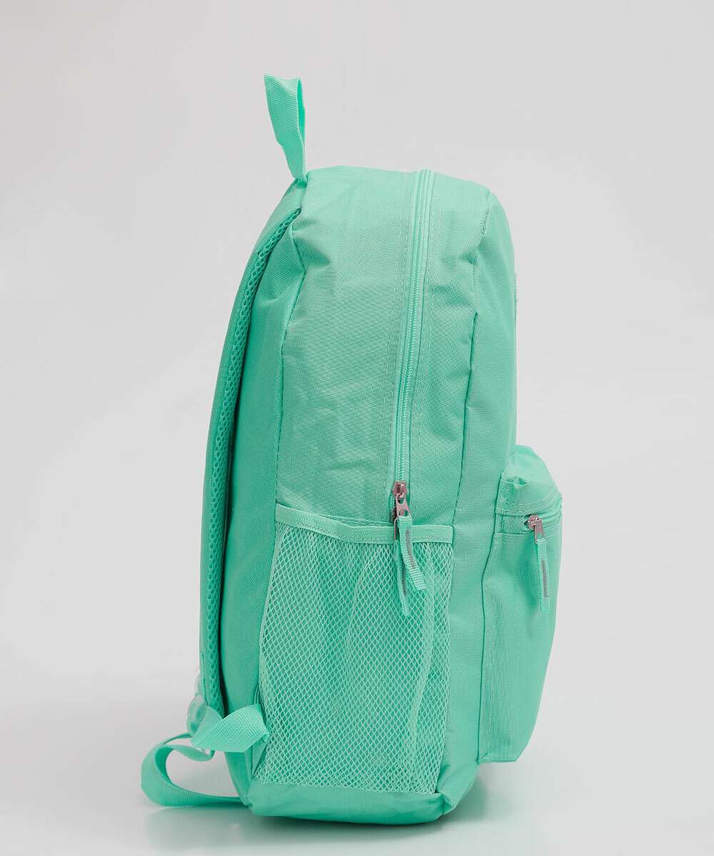 Mochila feminina confeccionada em tecido. Possui fechamento em zíper, repartição única, bolso frontal com zíper, bolsos laterais em tela, alça de mão, alças ajustáveis nas costas, acabamento e costura no tom.