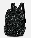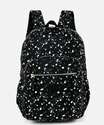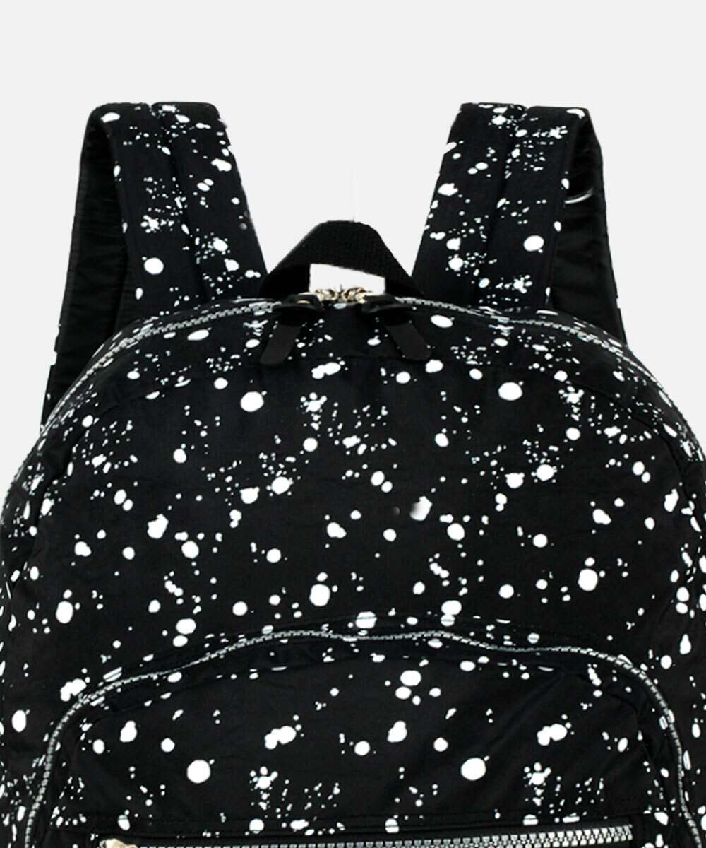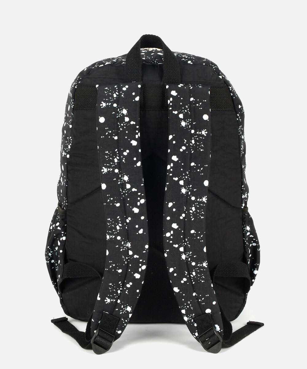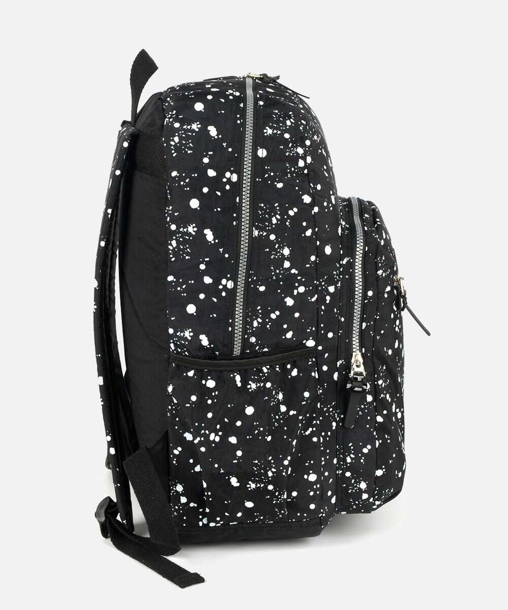 Mochila feminina confeccionada em tecido poliéster estampado. Possui repartição única com fechamento por zíper, bolsos frontais com zíper, alça de mão, alças nas costas ajustáveis, bolsos laterais, forro, acabamento e costura no tom.