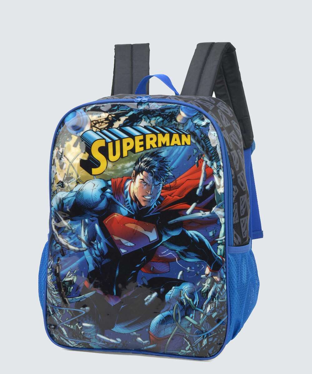 Mochila infantil escolar confeccionada em poliéster e PVC. Possui estampa do Superman, repartição única com fechamento por zíper, bolsos em tela nas laterais, alça de mão, alças ajustáveis nas costas, acabamento e costura no tom.