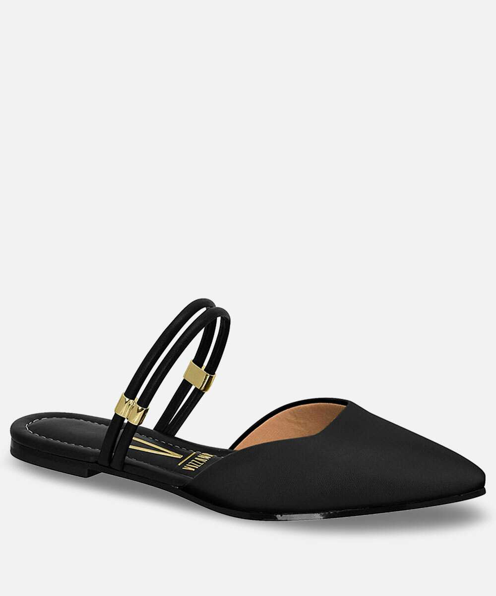 Mule feminino, confeccionado em material sintético, tiras com detalhes metalizados no cabedal e bico fino. Possui palmilha macia com forro, solado flexível, emborrachado com frisos antiderrapantes para garantir maior segurança e conforto ao caminhar.