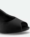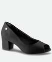 Peep toe feminino, confeccionado em material sintético, biqueira aberta e salto grosso baixo.