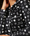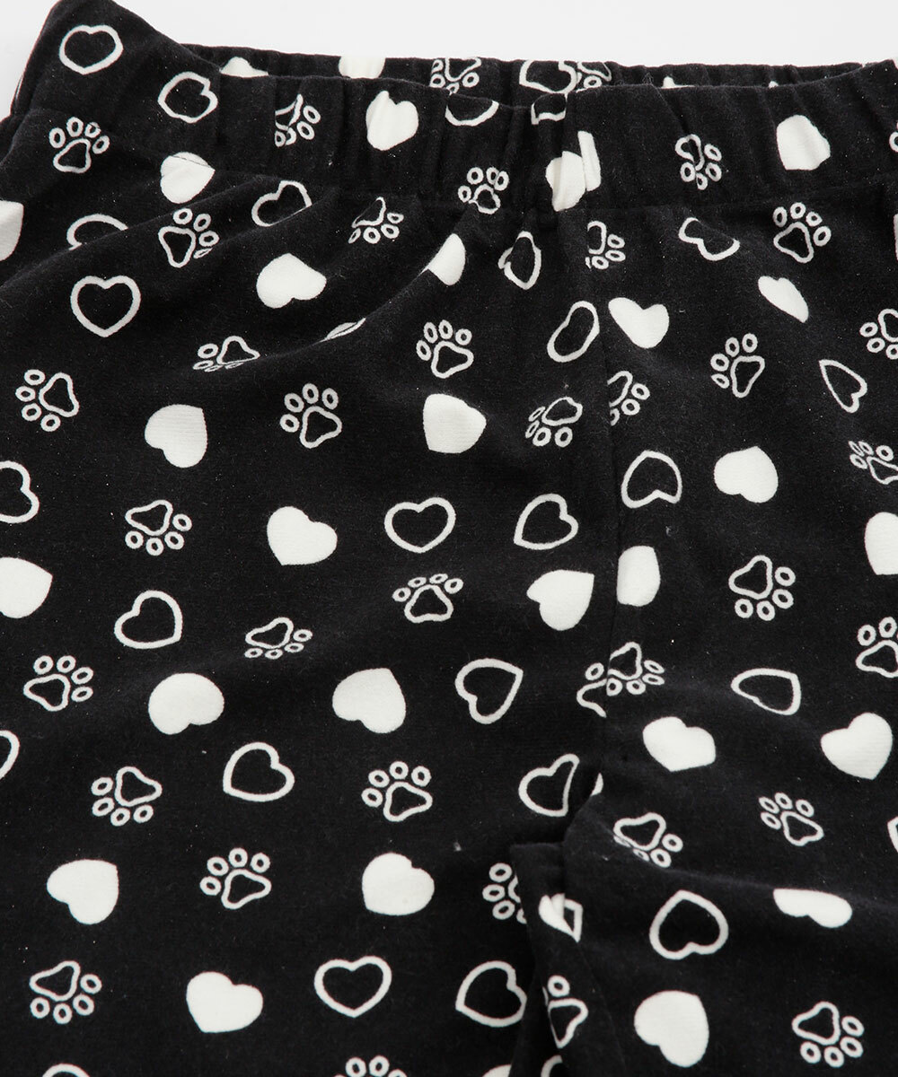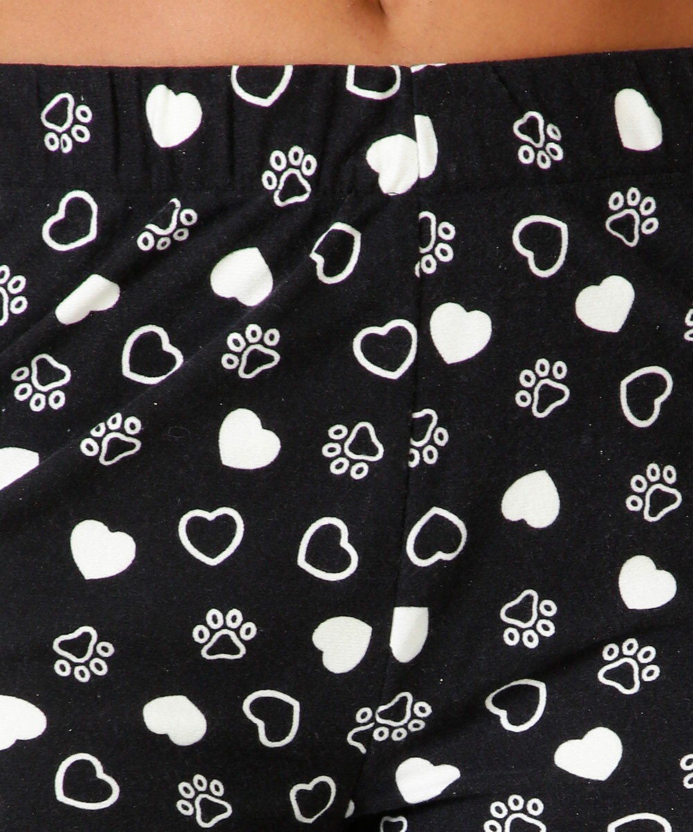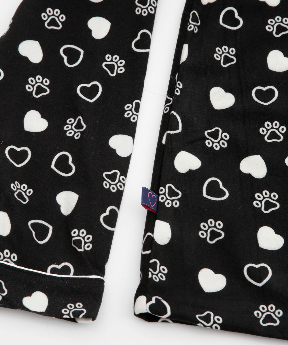 Pijama feminino, modelo americano, confeccionado em tecido poliéster, composto por blusa e calça com estampa de patinhas e corações. Possui blusa com gola dobrável, bolso lozalicado, fechamento por botões no entremeio, manga longa; calça com cós elástico, acabamento e costura no tom.