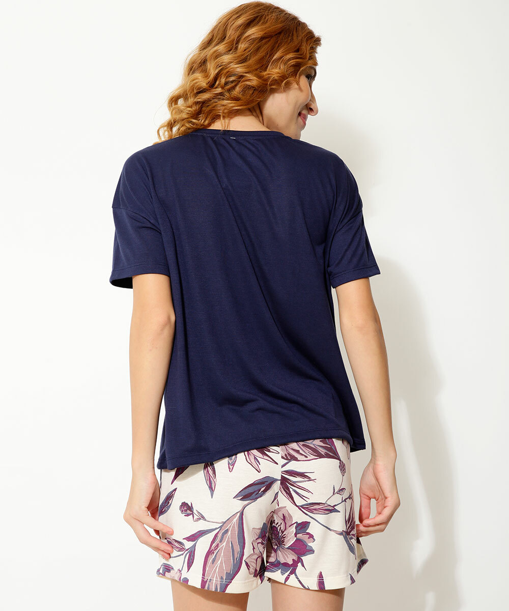 Pijama feminino, confeccionado em malha poliéster e viscose, composto por blusa e short. Possui blusa com decote redondo, estampa frase e floral, manga curta; short estampa floral com cós elástico, acabamento e costura no tom.