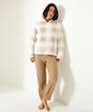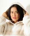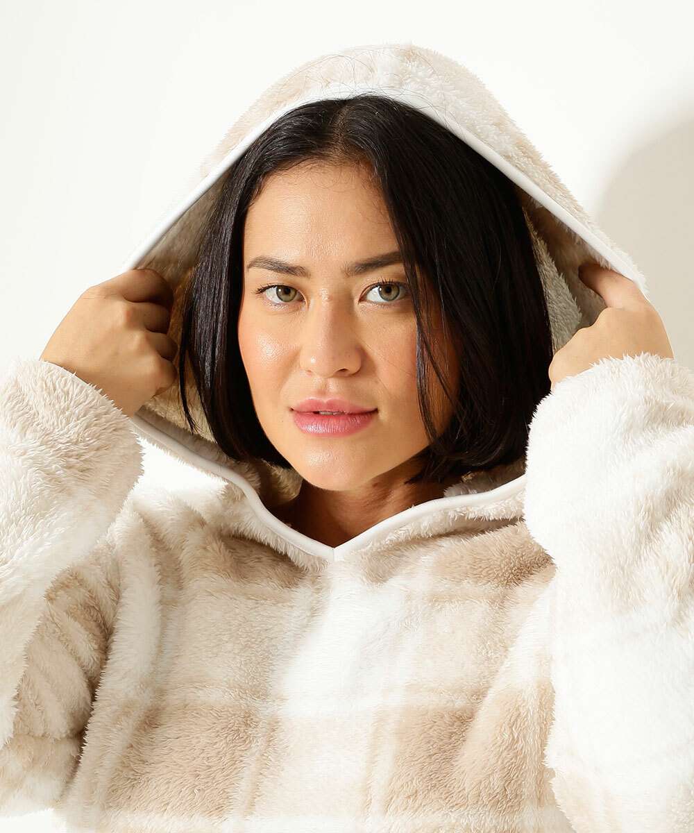 Pijama feminino, confeccionado em malha fleece e malha canelada, composto por blusa e calça. Possui blusa em malha fleece, capuz, manga longa, estampa quadriculada; calça em malha canelada, elástico no cós, acabamento e costura no tom.