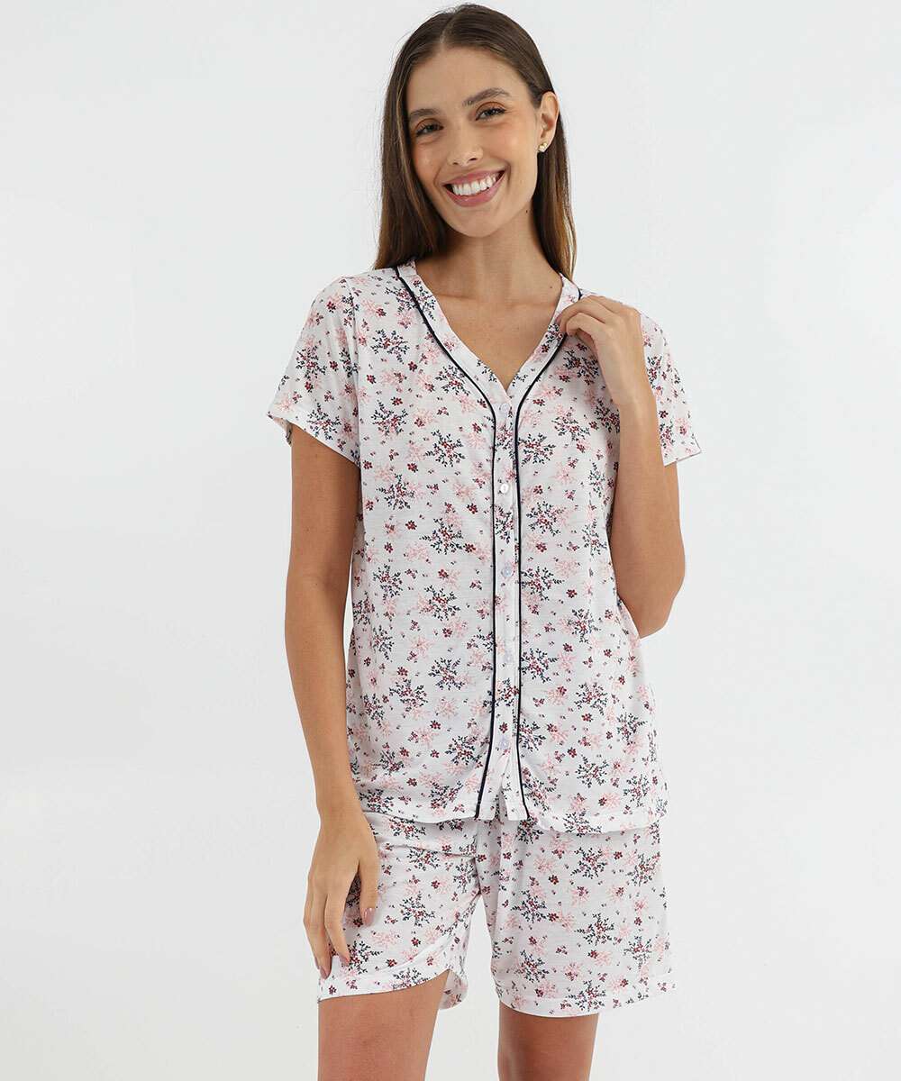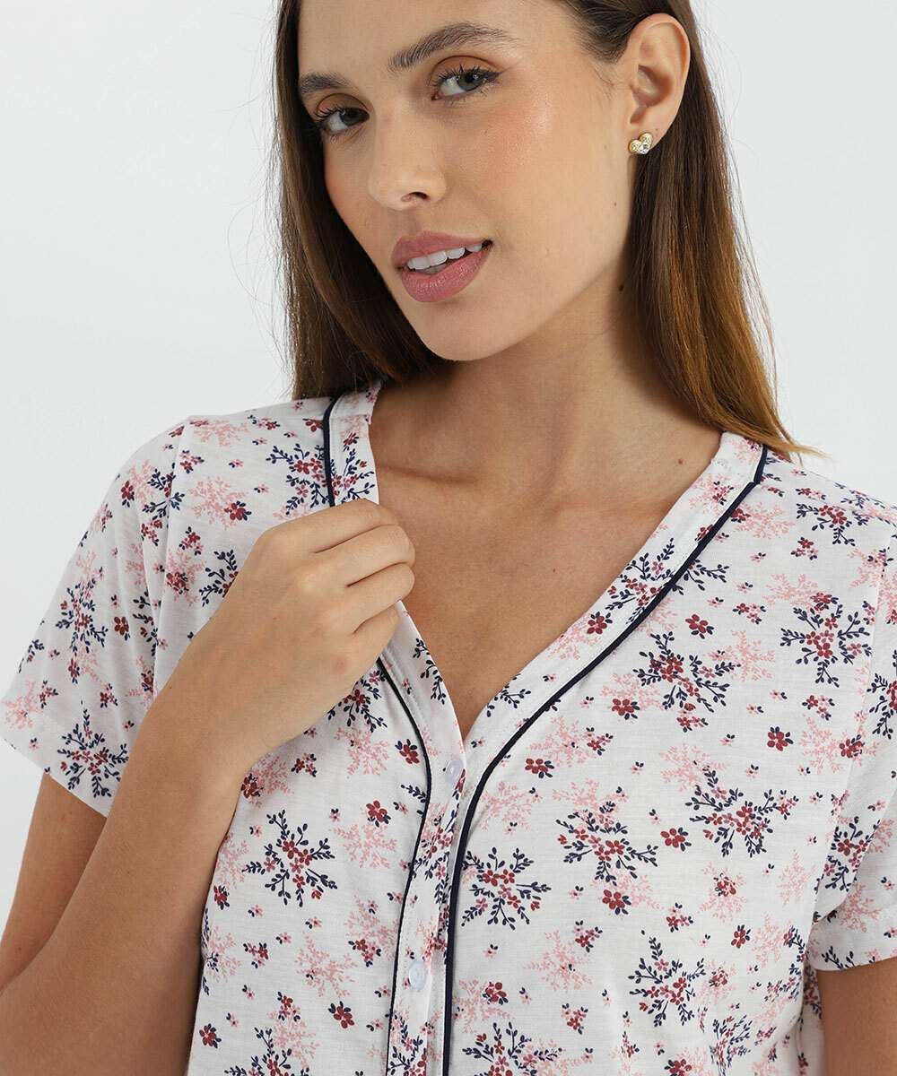 Pijama Feminino Flores Manga Curta Marisa Off White