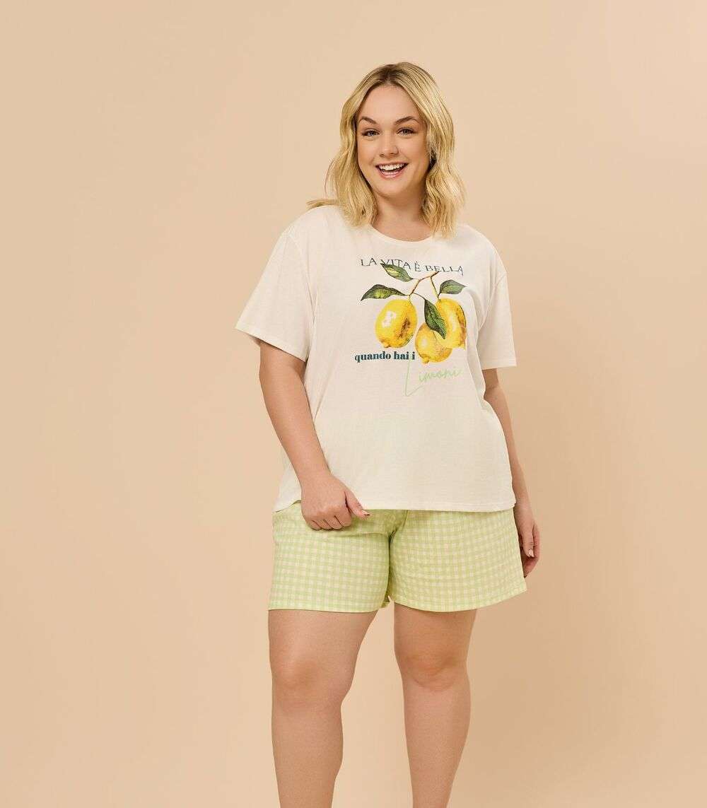 O Pijama Feminino Plus Size Manga Curta Evanilda é confeccionado em meia malha penteada 100% algodão, garantindo maciez e conforto para suas noites. A blusa possui mangas curtas, gola redonda e alegre estampa de limões, transmitindo frescor e descontração. O conjunto é completado por um shorts curto com estampa xadrez, que adiciona charme e estilo. Ideal para quem busca bem-estar, leveza e um visual moderno ao dormir.