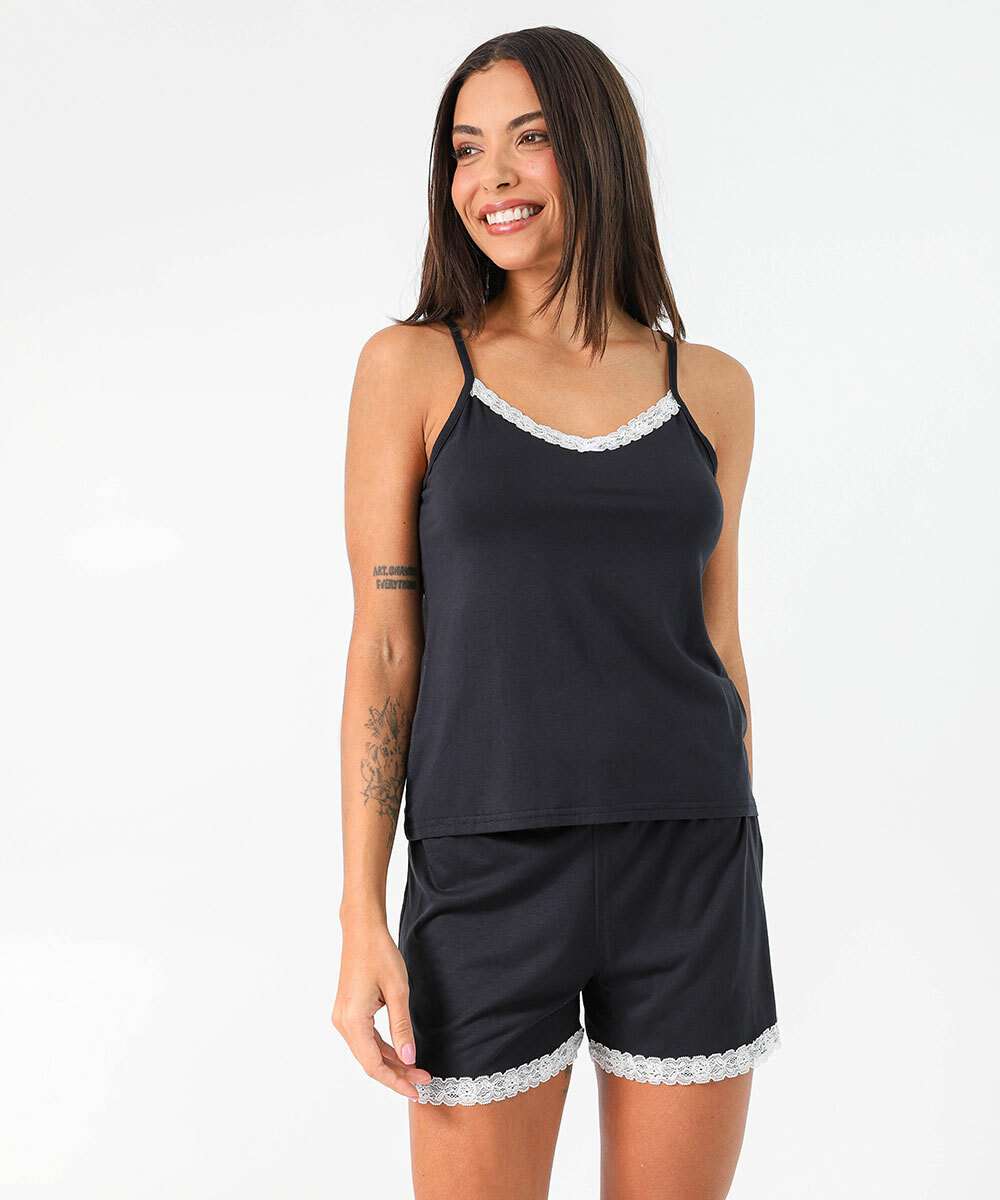 Pijama Feminino Recorte Renda Liso Marisa Preto