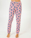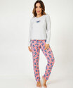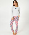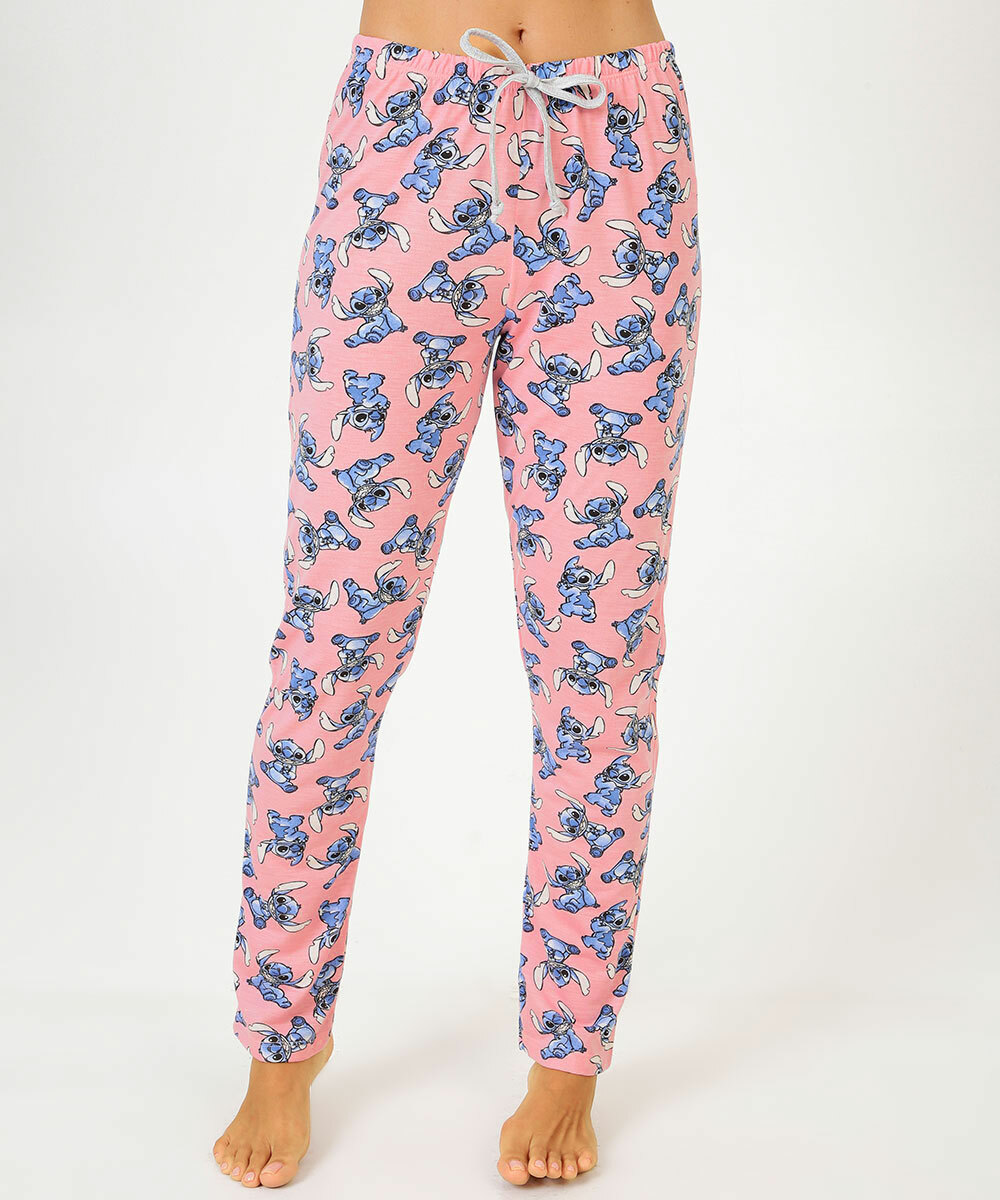 Pijama feminino, confeccionado em malha poliéster, viscose e elastano, composto por blusa e calça com estampa Stitch, personagem da Disney. Possui blusa com decote redondo e manga longa; calça com cós elástico, acabamento e costura no tom.