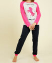 Pijama juvenil, confeccionado em malha, composto por blusa e calça. Possui blusa com estampa unicórnio e frase, decote redondo, manga longa; cala com cós elástico, barra com elástico, acabamento e costura no tom.