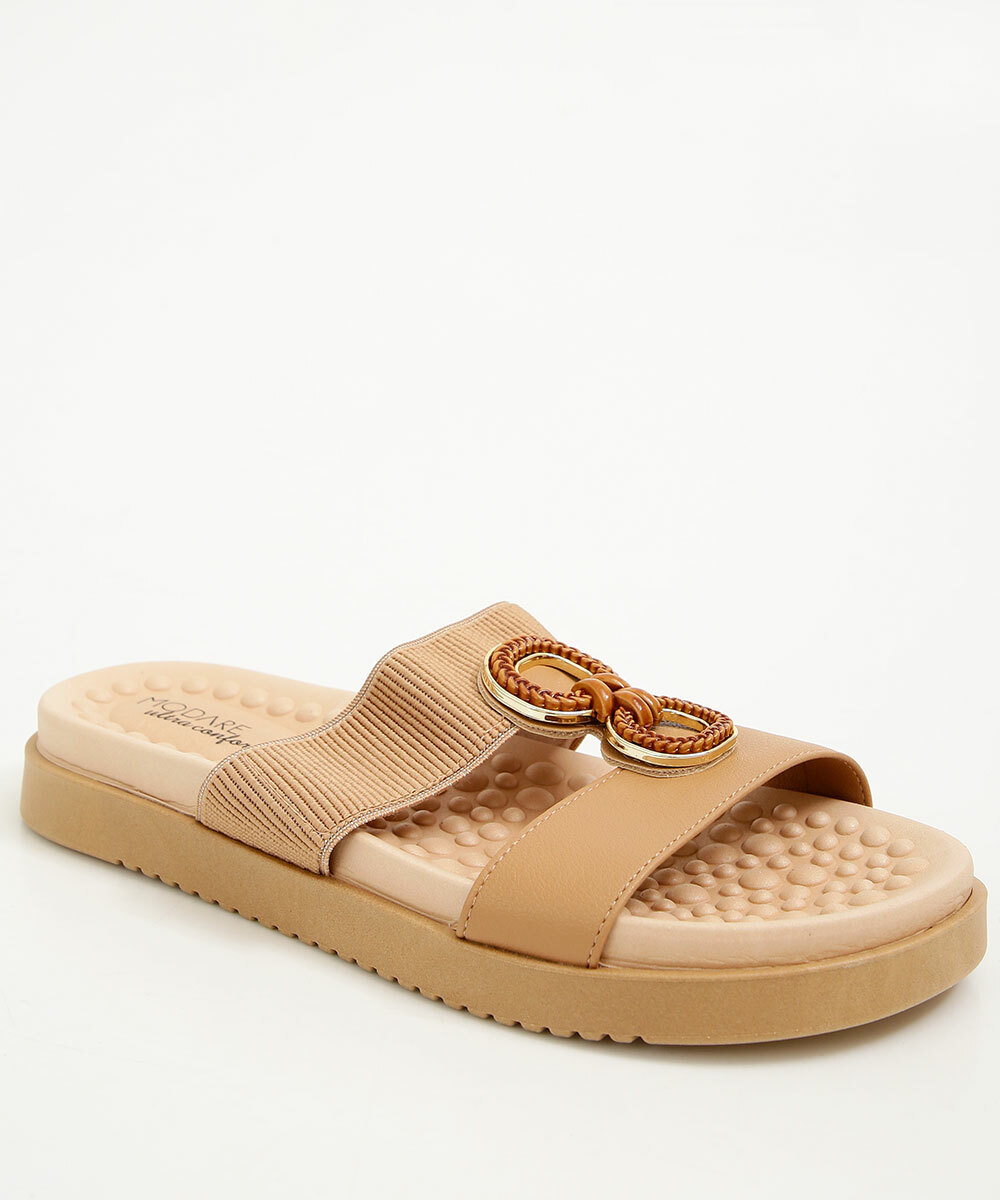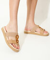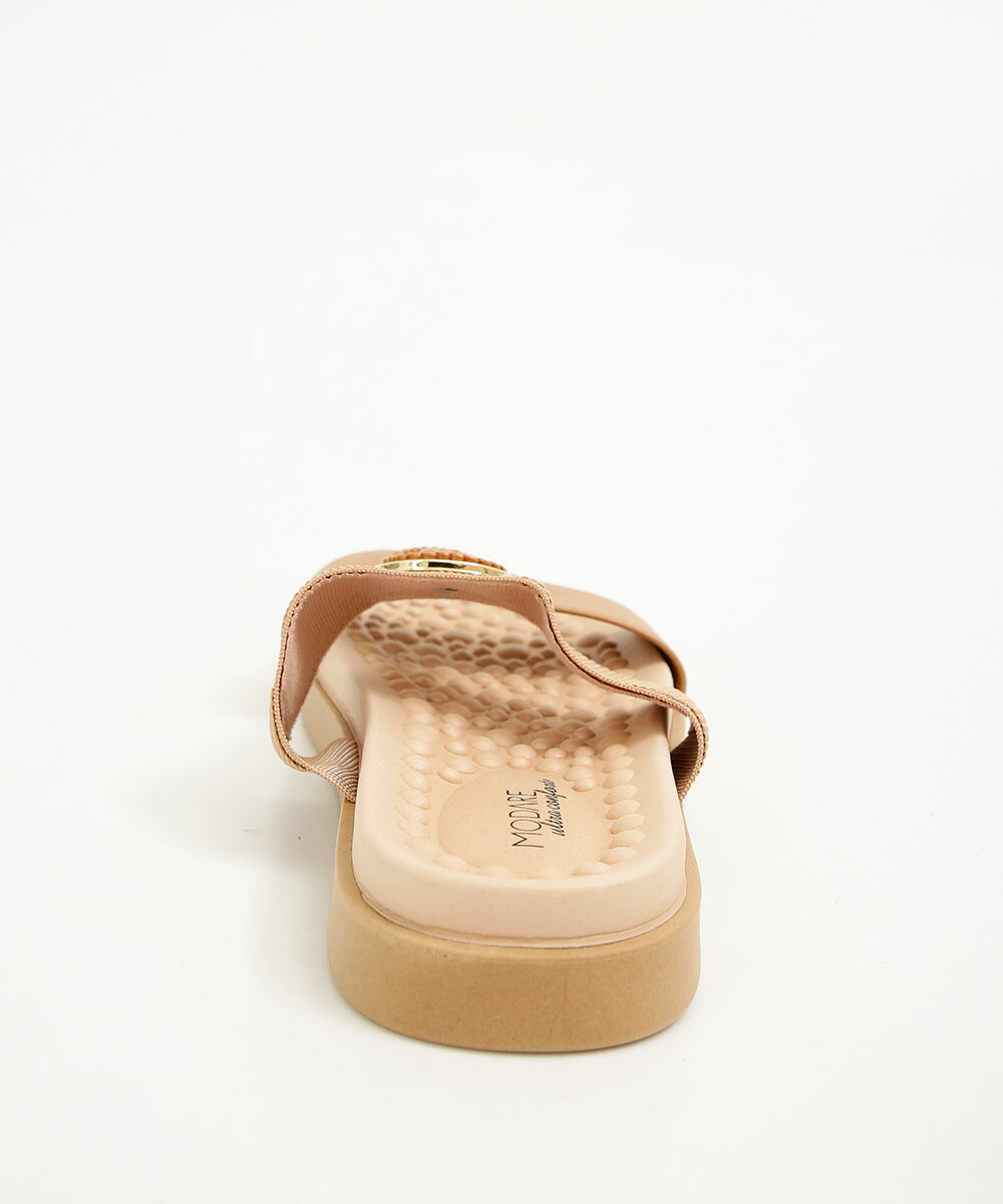 Rasteirinha feminina, confeccionada em material sintético e tiras no cabedal com pedraria.