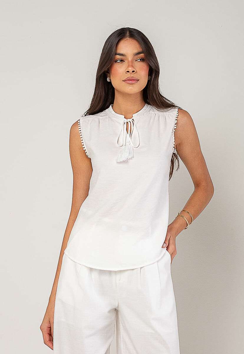 A regata feminina com amarração no decote é a escolha ideal para quem busca um visual leve, moderno e cheio de charme. Confeccionada em tecido fresco e fluido, ela proporciona conforto e liberdade de movimento, perfeita para os dias quentes e produções casuais.O destaque da peça está no decote com cordão ajustável e ponteiras em tassel, que adiciona um toque boho e descontraído ao visual. As cavas com acabamento em pompons delicados trazem um detalhe feminino, realçando o estilo leve e natural da blusa.Com modelagem soltinha e caimento suave, essa blusa combina facilmente com shorts, saias, calças de linho ou jeans, permitindo criar looks versáteis — do casual ao sofisticado, dependendo dos acessórios e calçados escolhidos. • Cordão com tassel • Acabamento em pompons nas cavas • Decote redondo com amarração Modelo veste tamanho P. Medidas da modelo: Altura 1,73cm | Busto 86cm | Cintura 67cm | Quadril 99cm Composição: 85% Algodão, 15% Poliéster.