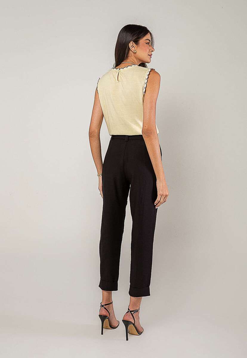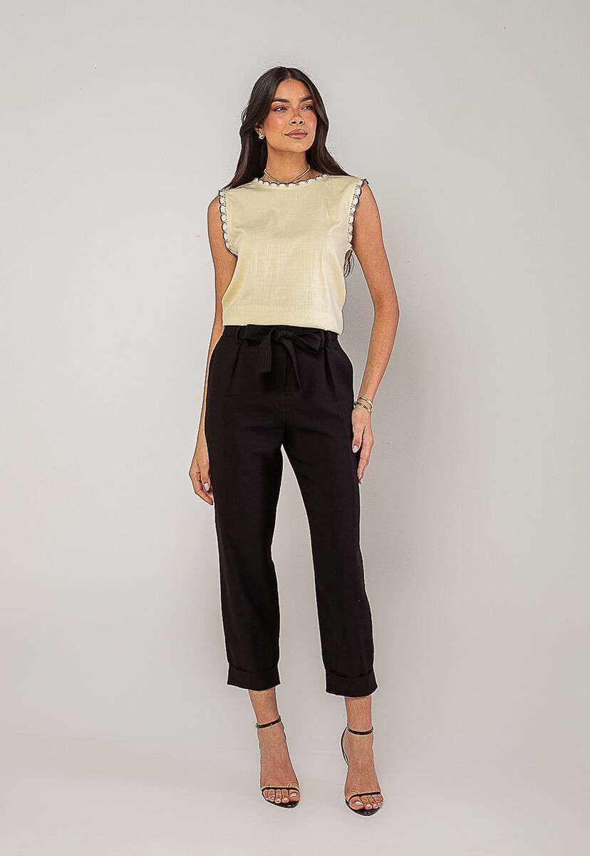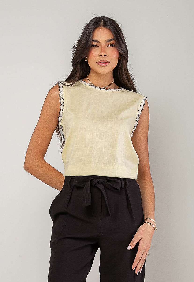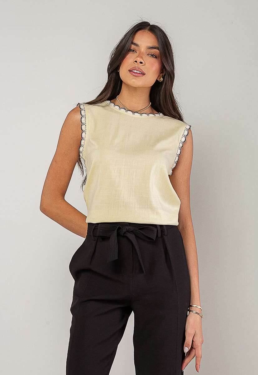 A regata feminina com detalhes em renda é a peça perfeita para quem busca um visual leve, romântico e sofisticado. Confeccionada em tecido leve e fluido, ela oferece conforto e caimento impecável, ideal para os dias mais quentes ou para compor looks elegantes em qualquer ocasião.O charme da peça está nos acabamentos em renda, presentes na gola e nas cavas, que adicionam um toque de feminilidade e estilo. O modelo sem mangas valoriza os ombros e proporciona frescor, enquanto o fechamento posterior com botão traz praticidade e delicadeza ao design.Versátil e fácil de combinar, essa blusa rose pode ser usada com jeans, saias, calças de alfaiataria ou shorts, criando desde produções casuais até combinações mais refinadas. • Renda na gola e nas cavas • Tecido leve e respirável • Botão nas costas Modelo veste tamanho P. Medidas da modelo: Altura 1,73cm | Busto 86cm | Cintura 67cm | Quadril 99cm Composição: 10% Algodão, 10% Linho.