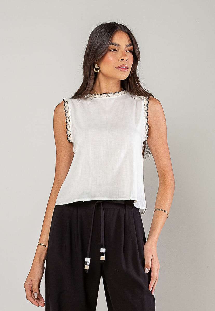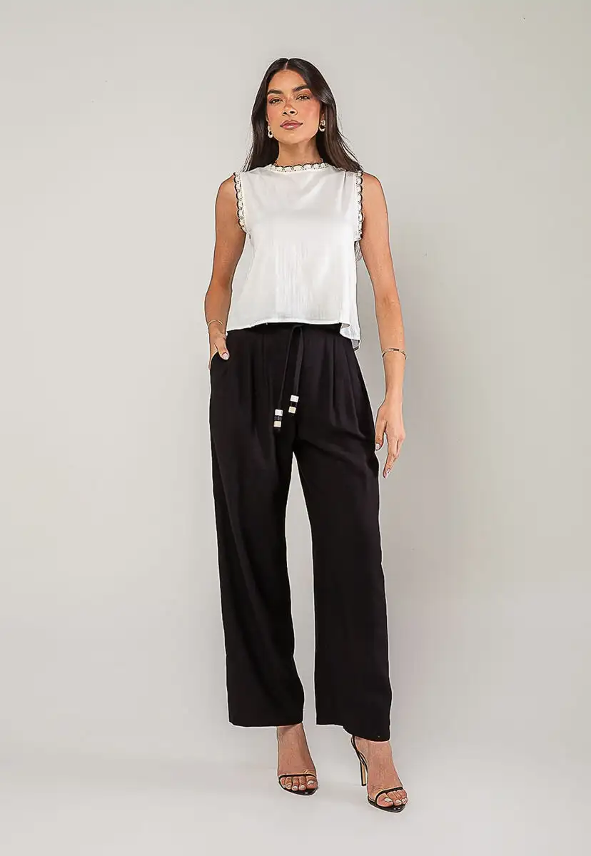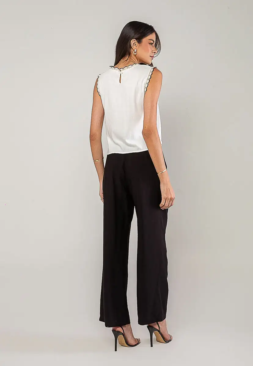 A regata feminina com detalhes em renda é a peça perfeita para quem busca um visual leve, romântico e sofisticado. Confeccionada em tecido leve e fluido, ela oferece conforto e caimento impecável, ideal para os dias mais quentes ou para compor looks elegantes em qualquer ocasião.O charme da peça está nos acabamentos em renda, presentes na gola e nas cavas, que adicionam um toque de feminilidade e estilo. O modelo sem mangas valoriza os ombros e proporciona frescor, enquanto o fechamento posterior com botão traz praticidade e delicadeza ao design.Versátil e fácil de combinar, essa blusa rose pode ser usada com jeans, saias, calças de alfaiataria ou shorts, criando desde produções casuais até combinações mais refinadas. • Renda na gola e nas cavas • Tecido leve e respirável • Botão nas costas Modelo veste tamanho P. Medidas da modelo: Altura 1,73cm | Busto 86cm | Cintura 67cm | Quadril 99cm Composição: 10% Algodão, 10% Linho.