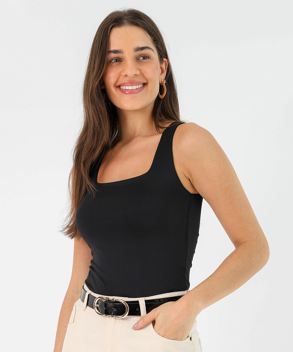 A regata feminina preta é um item essencial para compor looks modernos e elegantes. Com design minimalista e decote reto, valoriza o colo e traz um visual sofisticado na medida certa. Confeccionada em tecido macio e ajustável, proporciona conforto e ótimo caimento ao corpo. Perfeita para combinar com jeans, alfaiataria ou saias, sendo uma peça curinga para diversas ocasiões.