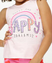 Regata infantil, ideal para meninas de 04 até 08 anos de idade, confeccionada em malha algodão. Possui estampa frontal frase, decote redondo, acabamento e costura no tom.