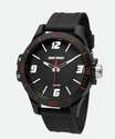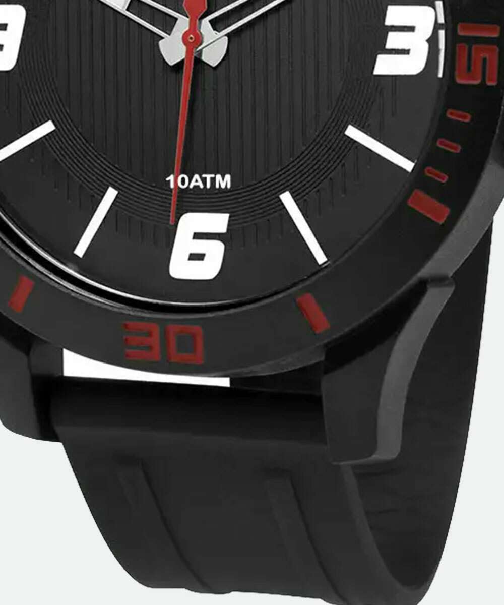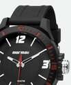 Relógio masculino com sistema analógico com ponteiros indicando as horas, minutos e segundos. Caixa em polímero com vidro em acrílico e pino para ajuste de horas. Mostrador personalizado com indicadores numerosos e tracejados. Pulseira em polímero com fechamento por fivela e aguilhão.