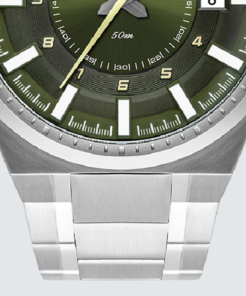 Relógio masculino com sistema analógico com ponteiros indicando as horas, minutos e segundos. Caixa em aço com vidro em cristal mineral e pino para ajuste de horas. Mostrador personalizado com calendário diário, função soneca e indicadores tracejados. Pulseira em aço trabalhado com fechamento por mola.