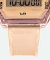 Relógio feminino com sistema digital indicando as horas, minutos e segundos. Caixa em polímero, vidro em cristal mineral e botões para ajuste de horas. Mostrador personalizado com alarme, calendário diário, formato 12/24 horas e iluminação noturna. Pulseira em polímero com fechamento por fivela e aguilhão.