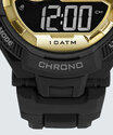Relógio masculino com sistema digital indicando as horas, minutos e segundos. Caixa em polímero com vidro em acrílico e pino para ajuste de horas. Possui a função alarme, iluminação noturna, cronômetro, calendário diário e formato 12/24 horas. Pulseira em polímero trabalhado e fechamento por fivela e aguilhão.