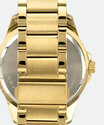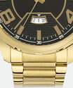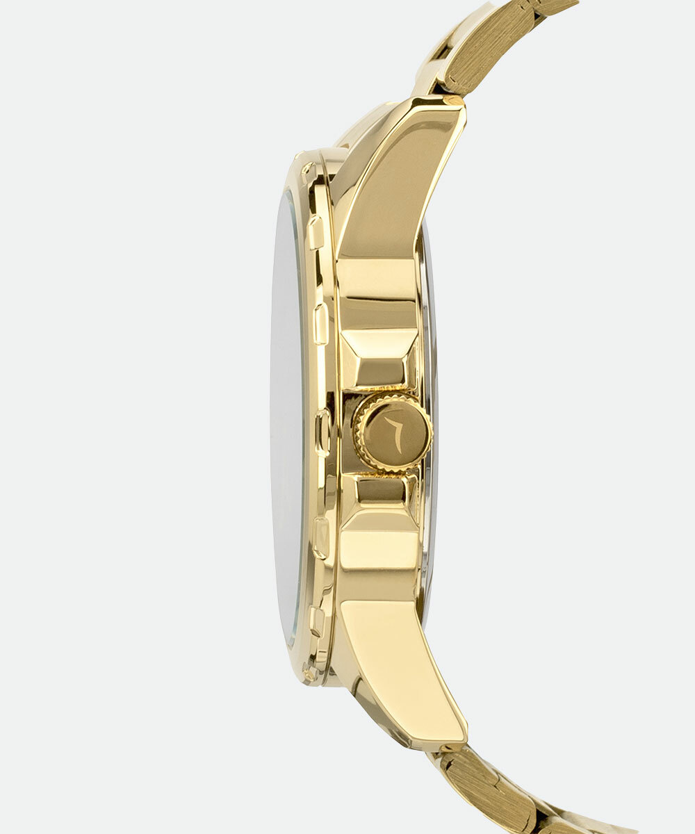 Relógio masculino com sistema analógico com ponteiros indicando as horas, minutos e segundos. Caixa em metal com vidro em cristal mineral e pino para ajuste de horas. Mostrador personalizado com calendário diário, indicadores numéricos e tracejados. Pulseira em aço trabalhado com fechamento por fecho dobrável.
