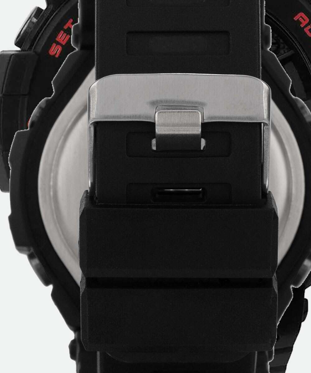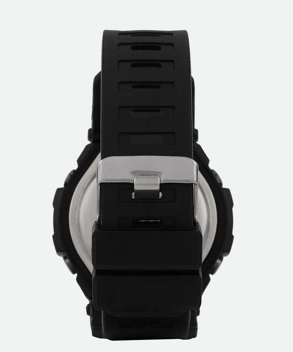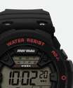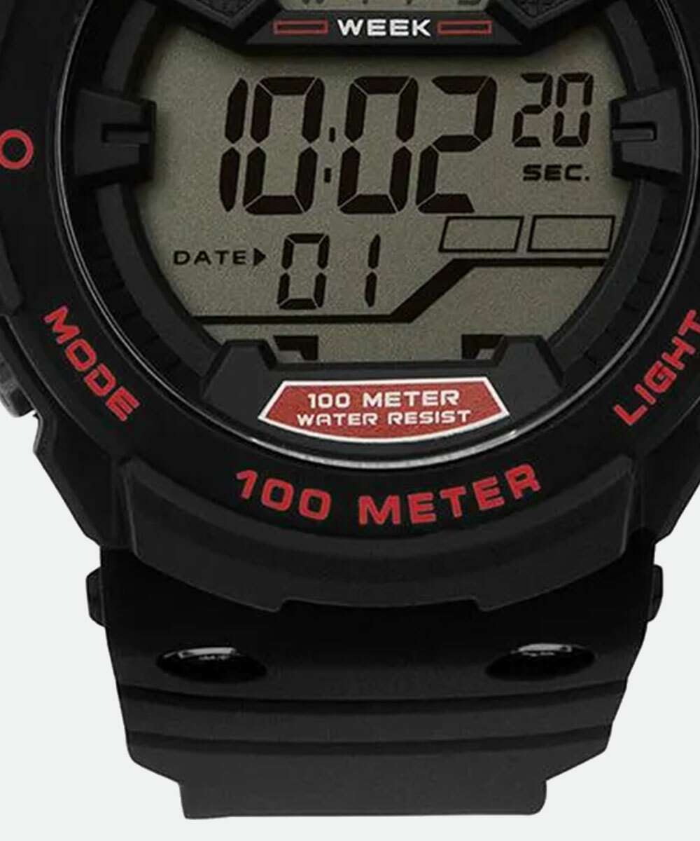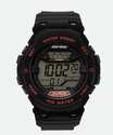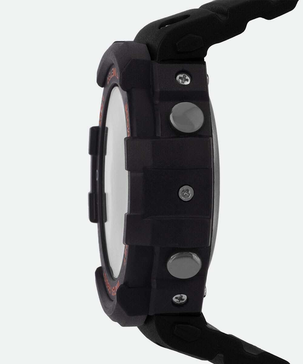 Relógio masculino com sistema digital indicando as horas, minutos e segundos. Caixa em polímero com vidro em acrílico e botões para ajuste de horas. Mostrador personalizado com alarme, formato 12/24 horas, iluminação noturna e cronômetro. Pulseira em polímero com fechamento por fivela e aguilhão.
