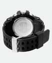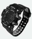 Relógio masculino com sistema digital indicando as horas, minutos e segundos. Caixa em plástico com vidro em acrílico e botões para ajuste de horas. Mostrador personalizado com alarme, caledário diário, iluminação noturna e cronômetro. Pulseira em silicone com fechamento por fivela.