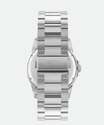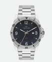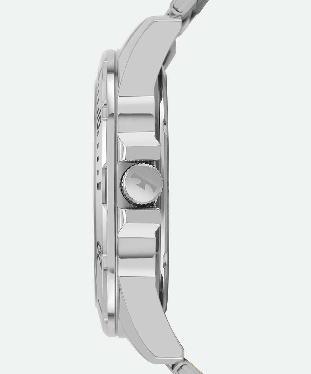 Relógio masculino com sistema analógico com ponteiros indicando as horas, minutos e segundos. Caixa em aço com vidro em cristal mineral e pino para ajuste de horas. Mostrador personalizado com calendário diário, indicadores numéricos e tracejados. Pulseira em aço trabalhado com fechamento por botão lateral.