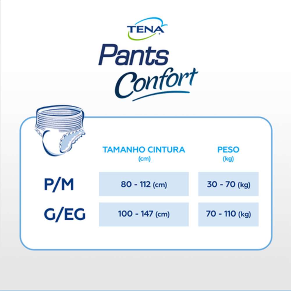 Roupa Íntima Tena Pants Confort G/EG 8 unidades Pants Confort é uma roupa íntima descartável indicada para quem sofre com incontinência urinária moderada a severa. É unissex, segura, discreta e fácil de usar, basta vestir como se fosse uma roupa íntima. Como Tena Pants Confort funciona?Com rápida absorção e ajuste perfeito ao corpo, Pants Confort é a opção ideal para perda de urina moderada a severa. Isso porque possui a tecnologia High Soft, uma camada que absorve rapidamente grandes quantidades de urina, mantendo o usuário seco, confortável e reduzindo o risco de causar irritações e infecções na pele. Como uma roupa íntima, é fácil de vestir e confortável de usar, sendo uma ótima opção para pessoas ativas. Benefícios de Tena Pants Confort: Unissex, desenvolvida para ajustar perfeitamente ao corpo.Fácil de vestir e de usar, possui uma cintura elástica para o melhor ajuste.Possui rápida absorção da urina, mesmo em grandes quantidades.Reduz a possibilidade de irritações e infecções de pele.Segura, confortável e discreta, ideal para pessoas ativas.Toque suave à pele.Como usar a Roupa Íntima Descartável Tena Pants Confort?Basta vestir como se fosse uma roupa íntima. Possui uma cintura elástica para o melhor ajuste. Alerta:Em caso de incontinência urinária severa, troque sua Pants Confort no máximo a cada 3 horas. Consulte sempre o seu médico. Composição:Camada interna e externa de tecido de não fibras de polipropileno, camada interna de polietileno, fibras de celulose, polímero superabsorvente, fios de elastano e adesivos termoplásticos. Advertências:Manter fora do alcance de crianças.Em caso de irritação, suspender o uso e procurar orientação médica.Armazenar fora do calor excessivo.Consulte sempre o seu médico.Não descartar no vaso sanitário.