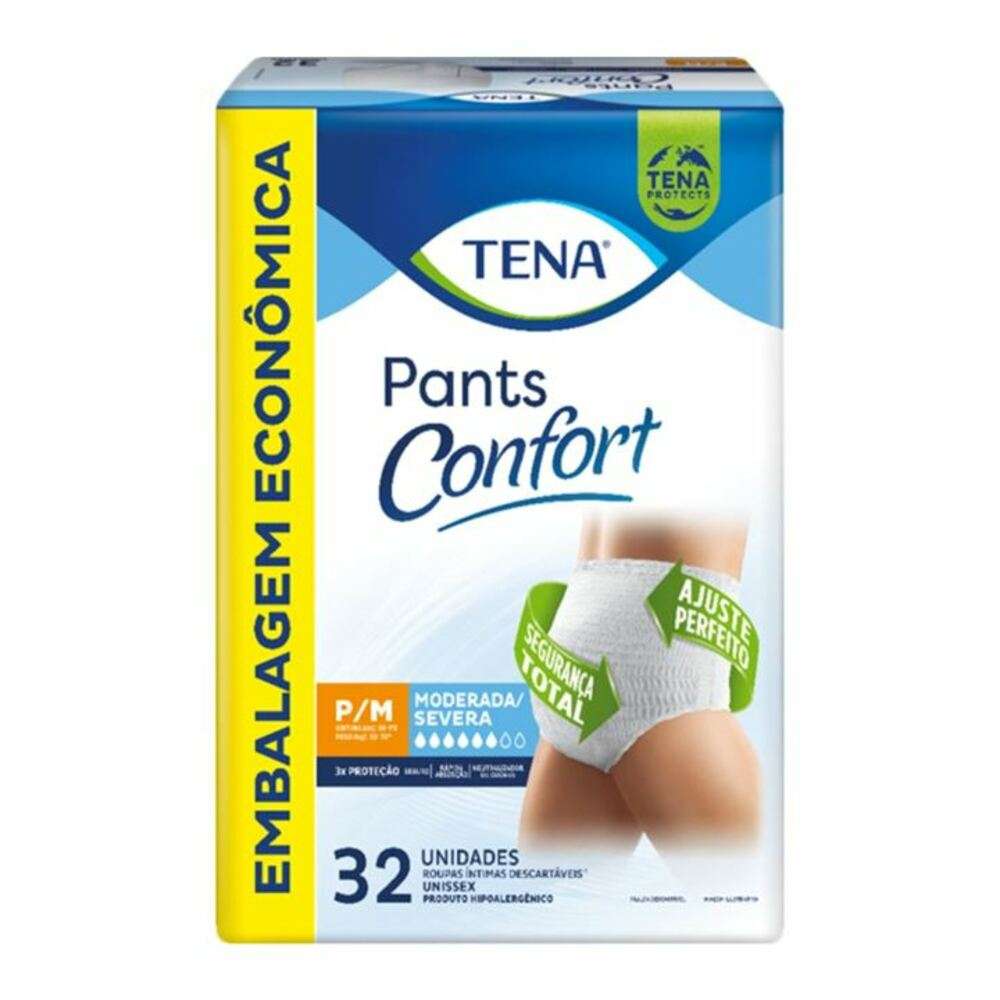 Roupa Intima Tena Pants Confort P/M Com 32 Unidades Pants Confort é uma roupa íntima descartável indicada para quem sofre com incontinência urinária moderada a severa. É unissex, segura, discreta e fácil de usar, basta vestir como se fosse uma roupa íntima. Como Tena Pants Confort funciona?Com rápida absorção e ajuste perfeito ao corpo, Pants Confort é a opção ideal para perda de urina moderada a severa. Isso porque possui a tecnologia High Soft, uma camada que absorve rapidamente grandes quantidades de urina, mantendo o usuário seco, confortável e reduzindo o risco de causar irritações e infecções na pele. Como uma roupa íntima, é fácil de vestir e confortável de usar, sendo uma ótima opção para pessoas ativas. Benefícios de Tena Pants Confort: Unissex, desenvolvida para ajustar perfeitamente ao corpo.Fácil de vestir e de usar, possui uma cintura elástica para o melhor ajuste.Possui rápida absorção da urina, mesmo em grandes quantidades.Reduz a possibilidade de irritações e infecções de pele.Segura, confortável e discreta, ideal para pessoas ativas.Toque suave à pele.Como usar a Roupa Íntima Descartável Tena Pants Confort?Basta vestir como se fosse uma roupa íntima. Possui uma cintura elástica para o melhor ajuste. Alerta:Em caso de incontinência urinária severa, troque sua Pants Confort no máximo a cada 3 horas. Consulte sempre o seu médico. Composição:Camada interna e externa de tecido de não fibras de polipropileno, camada interna de polietileno, fibras de celulose, polímero superabsorvente, fios de elastano e adesivos termoplásticos. Advertências:Manter fora do alcance de crianças.Em caso de irritação, suspender o uso e procurar orientação médica.Armazenar fora do calor excessivo.Consulte sempre o seu médico.Não descartar no vaso sanitário.