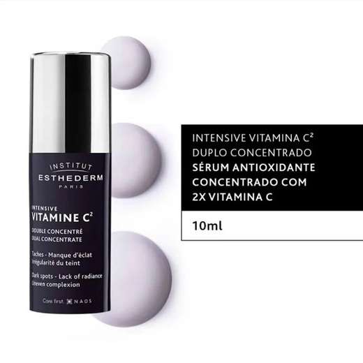 Sérum facial antioxidante para todos os tipos de pele. Esthederm Intensive Vitamine C² ilumina, uniformiza e previne o envelhecimento da tez, com resultados comprovados a partir de 14 dias. O Sérum Facial Esthederm Intensive Vitamine C² é o 1º sérum antioxidante com duas formas de Vitamina C: 10% de Vitamina C pura, que tem uma potente ação antioxidante e 2% Pró-Vitamina C de liberação prolongada, que tem uma ação Redutor de Linhas duradoura. O produto conta com uma textura leve e de absorção imediata, além de dupla dose e dupla eficácia contra os sinais da idade.