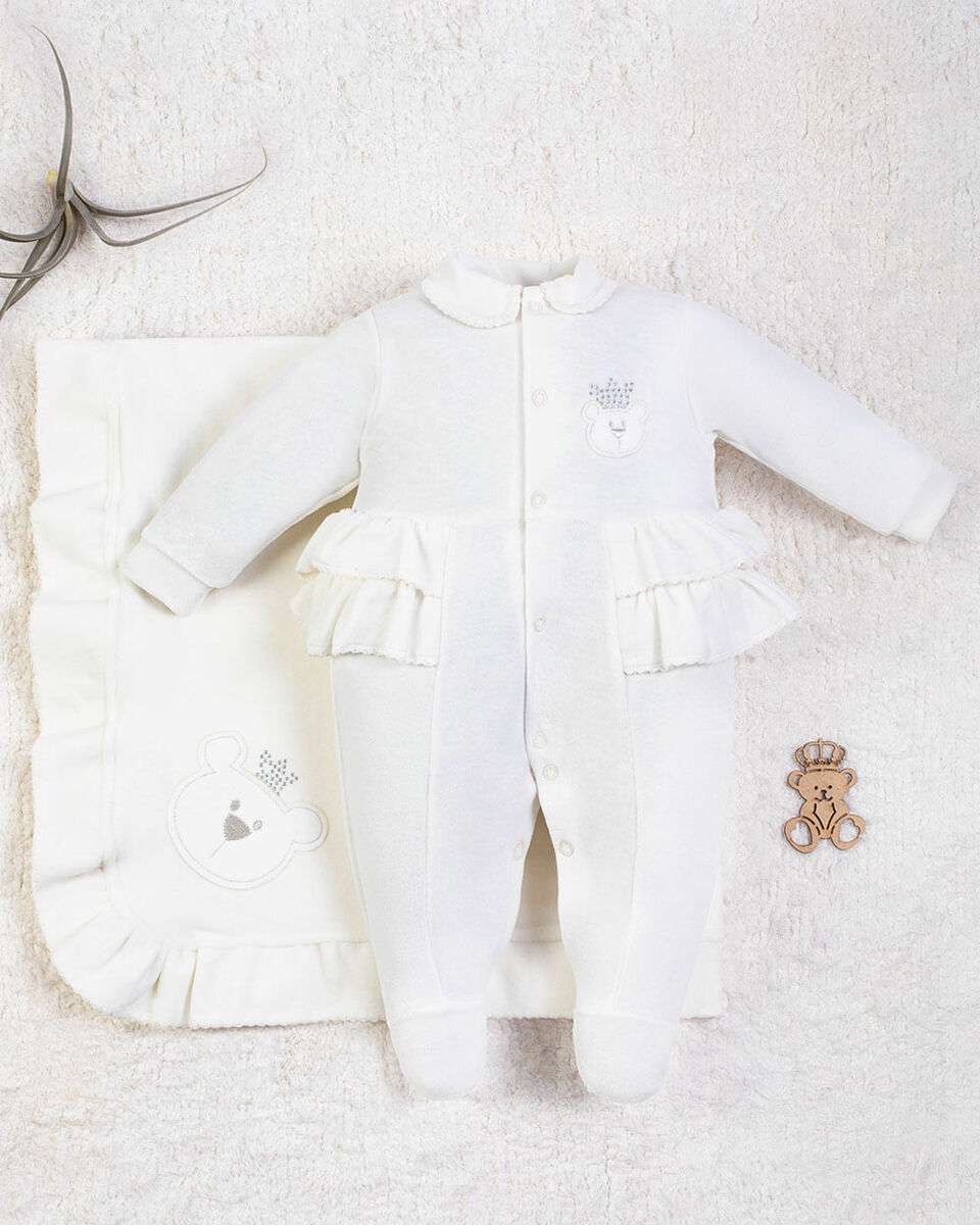 Saída de Maternidade composta por:- Macacão em Plush com babados franzidos na cintura tipo bunda rica, aplicações bordadas e strass, golinha fixada pra não sufocar o bebê com acabamento em bordado picueta, abertura frontal. Manta Dupla em Plush de 80 cm x 80 cm com detalhe de bordado com aplicações e strass, barrado franzido com acabamento em bordado de picueta.