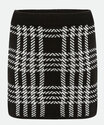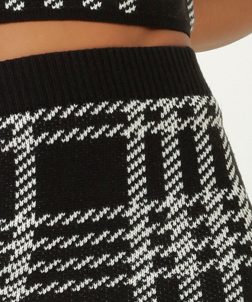 Saia feminina, modelo curta, confeccionada em malha tricô. Possui cintura alta, estampa pied poule, cós com elástico, acabamento e costura no tom.
