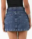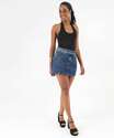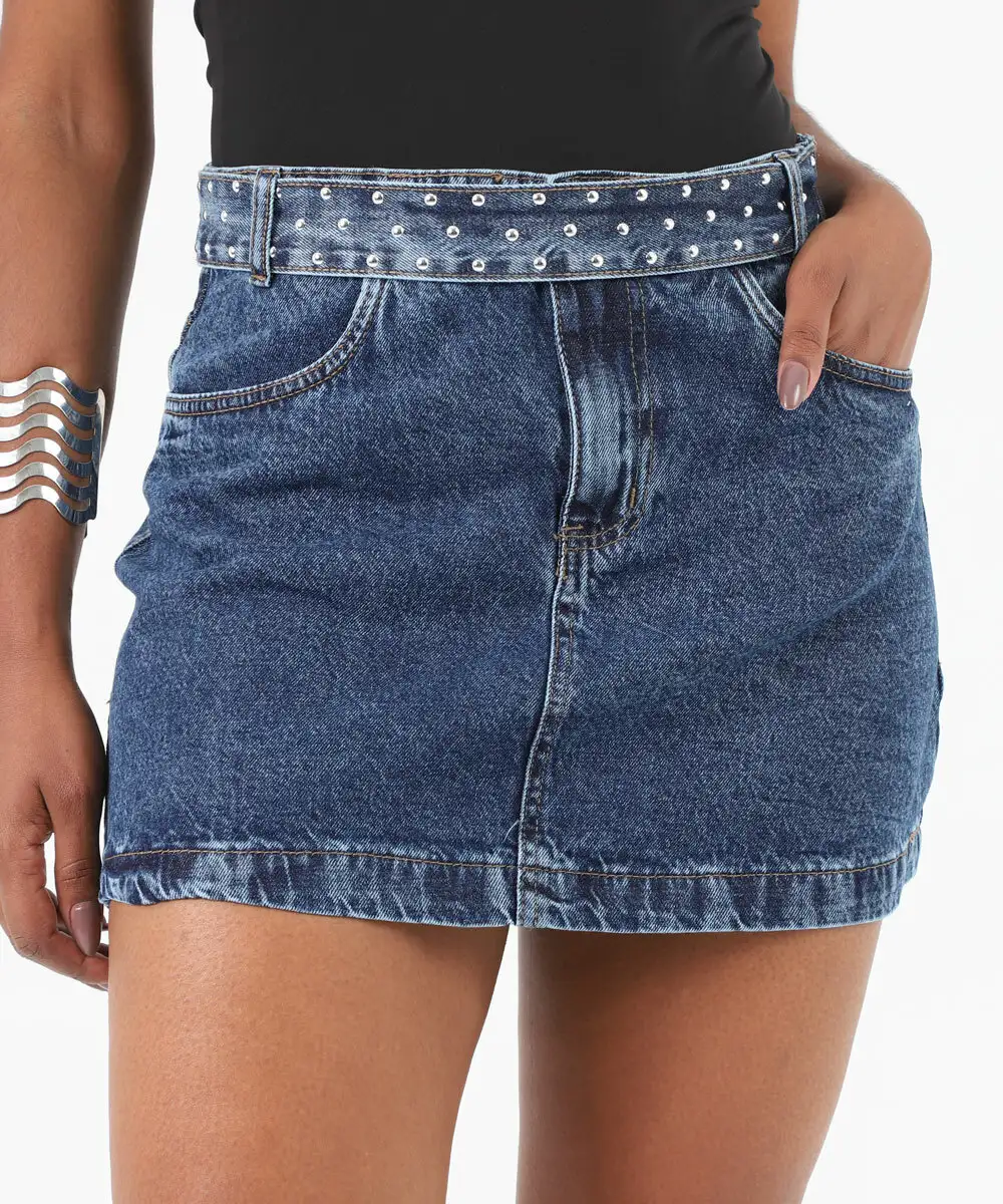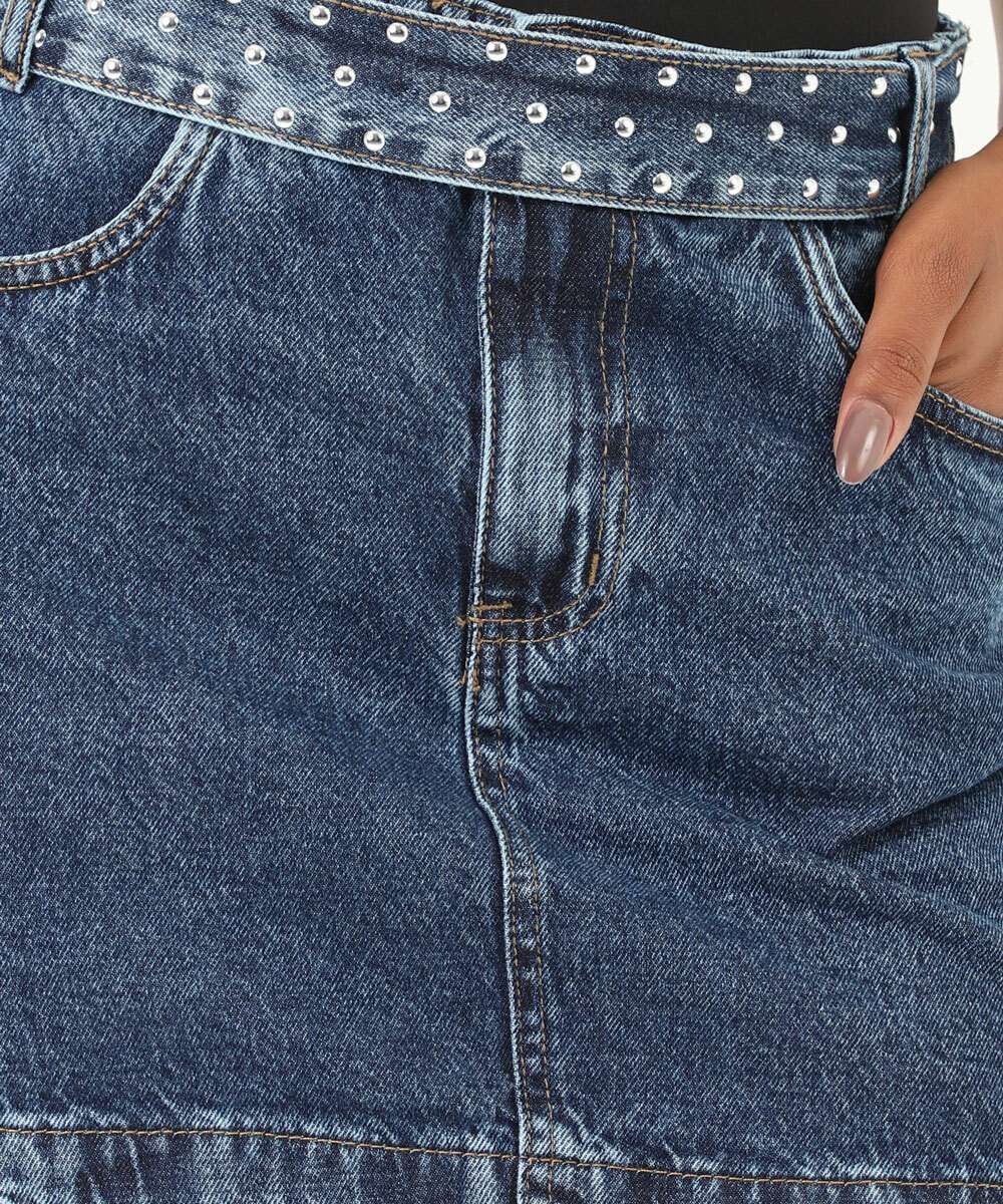 Saia Jeans Feminina Bolsos Cinto Tachas Azul