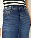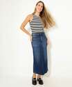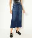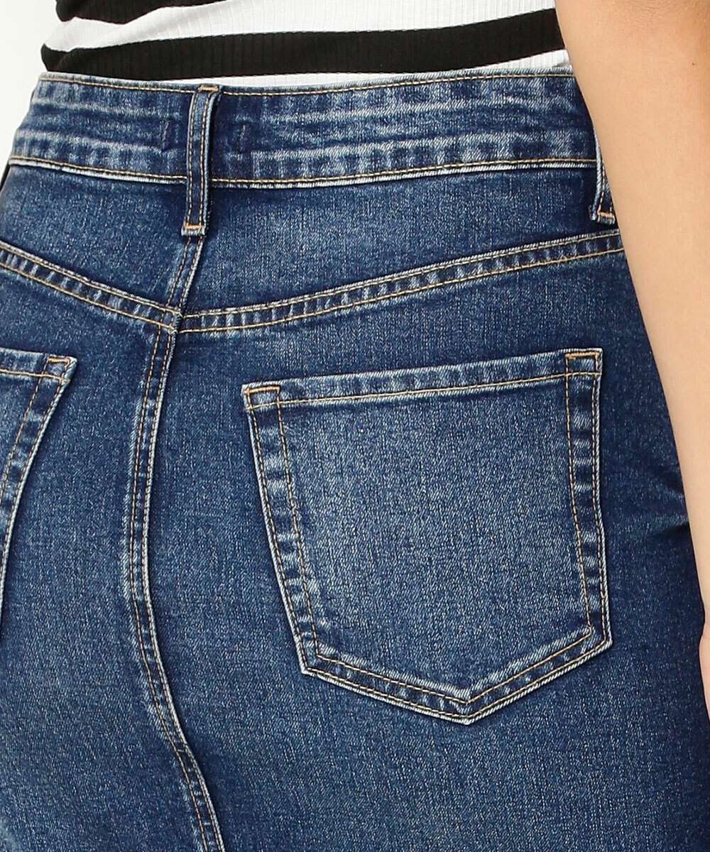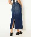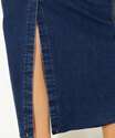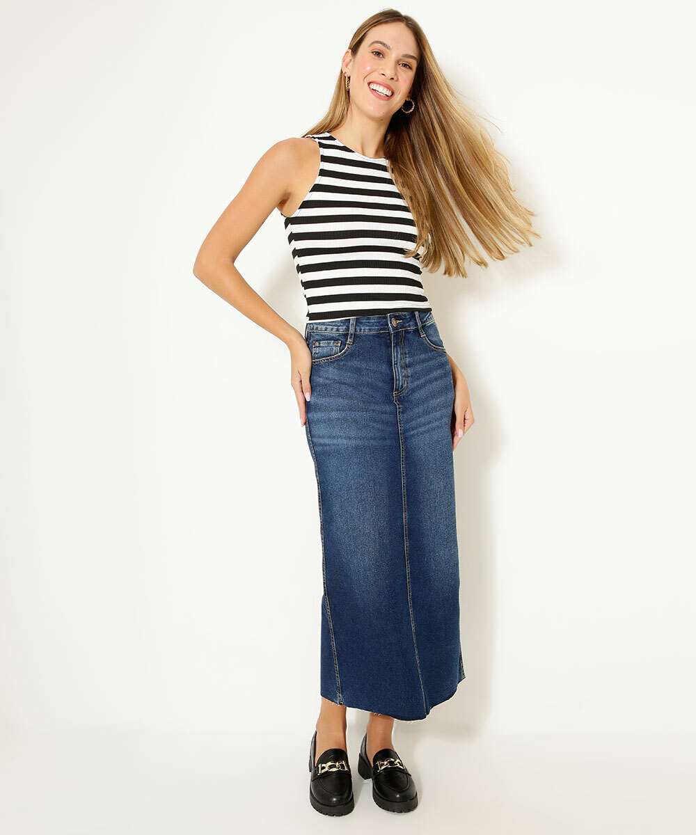 Saia feminina, modelo midi, confeccionada em tecido plano jeans. Possui cós com passantes, fechamento por botão e zíper no entremeio, fenda atrás, bolsos frontais e atrás, acabamento no tom e costura contrastante.