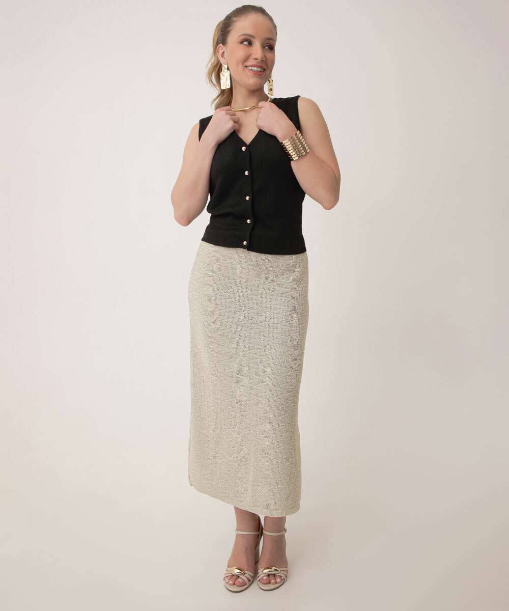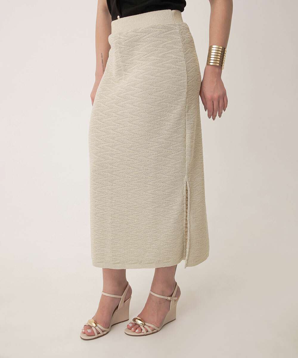Saia Midi Feminina Tricô Brilho Lurex Fenda Marisa