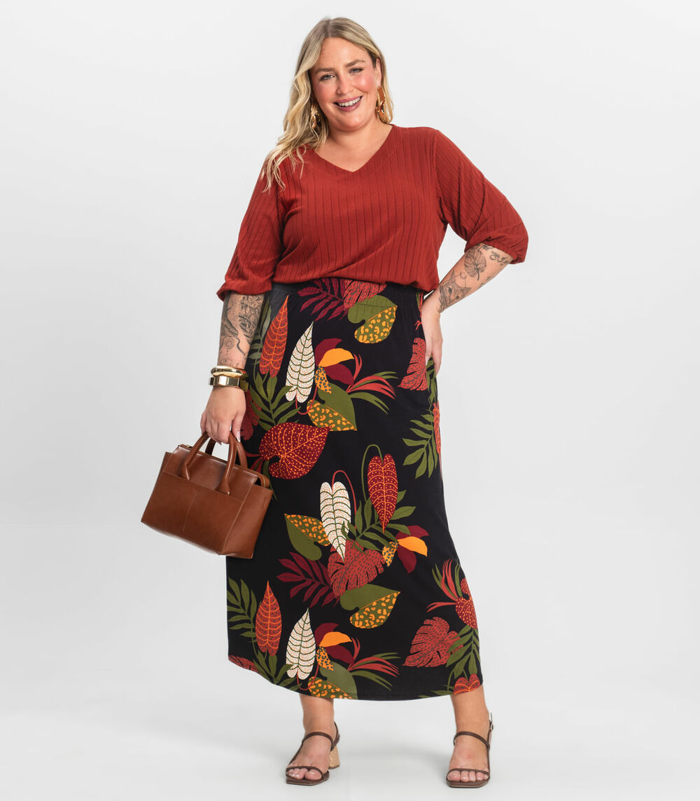 A Saia Midi Plus Size Infinita Cor é confeccionada em malha Visco Premiere, oferecendo caimento leve e toque macio. Possui cós com elástico embutido para ajuste confortável na cintura. Conta com estampa rotativa, que garante um visual moderno e único, e acabamento na barra com bainha reforçada. Ideal para compor looks elegantes e práticos no dia a dia, combinando estilo e conforto para todos os momentos.