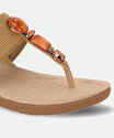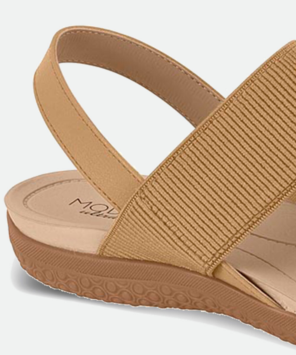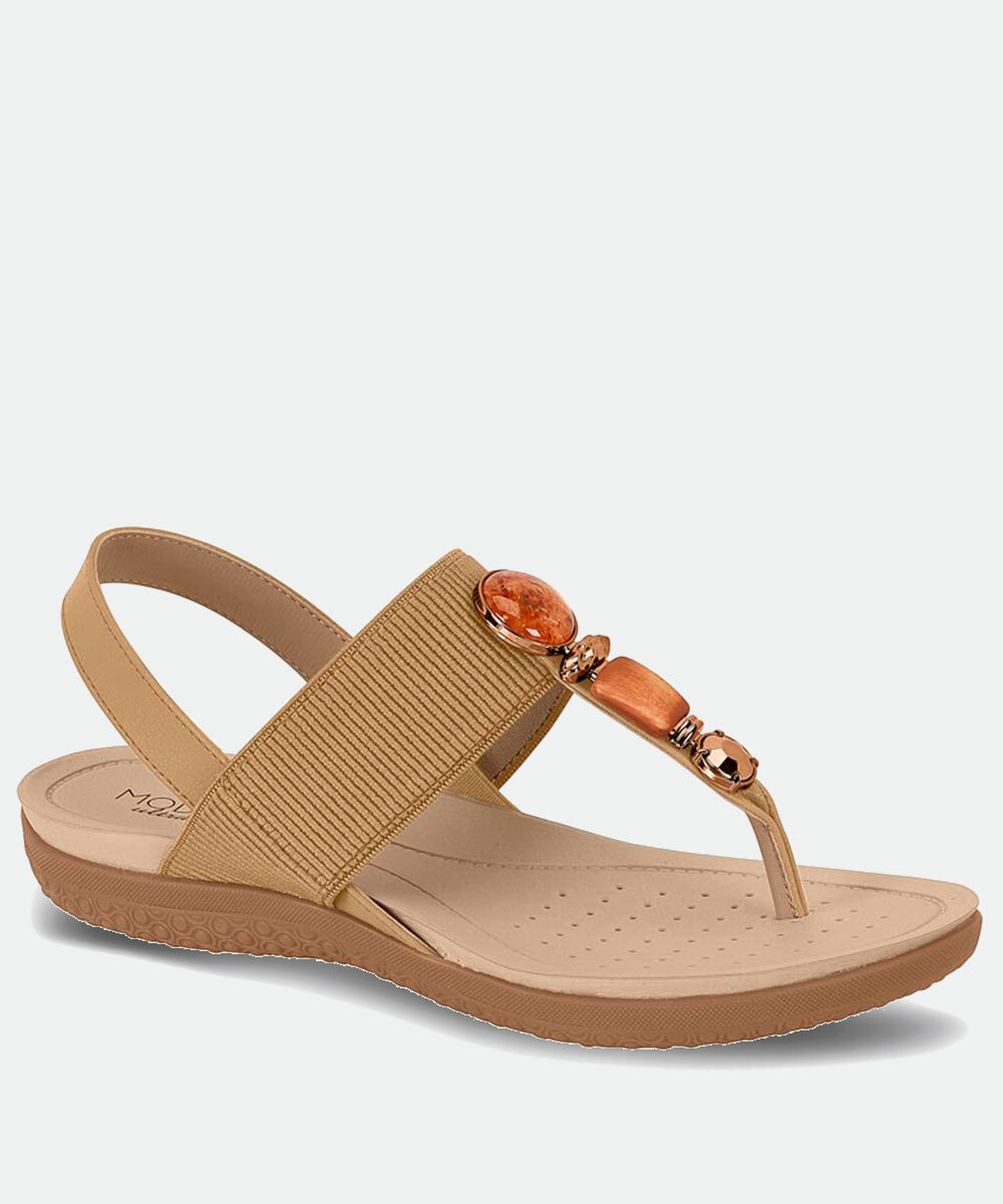 Sandália feminina rasteira, confeccionada em material sintético, tira no cabedal com pedrarias decorativas, palminha com esferas ultraconforto massageadoras, fechamento por tira com elástico.
