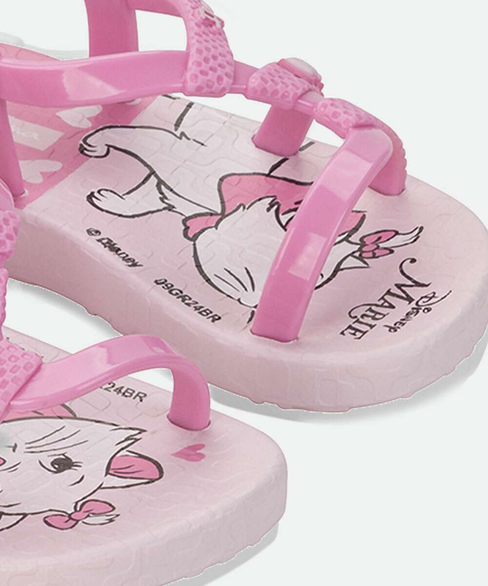 Sandália infantil, coleção Disney Carinho, confeccionada em PVC, tira trabalhada no cabedal, textura, palmilha estampa Gata Marie, fechamento por tira com pinos de encaixe.