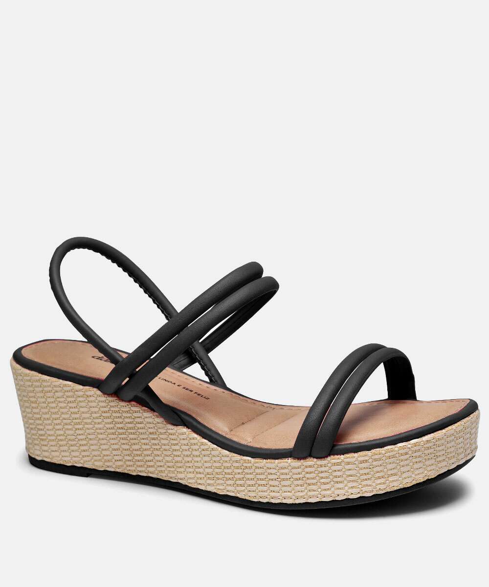 Sandália feminina, confeccionada em material sintético bicolor. Possui tiras no cabedal, salto baixo anabela e fechamento por tira no calcanhar. Possui palmilha macia com forro, solado rígido, emborrachado com frisos antiderrapantes para garantir maior segurança e conforto ao caminhar.