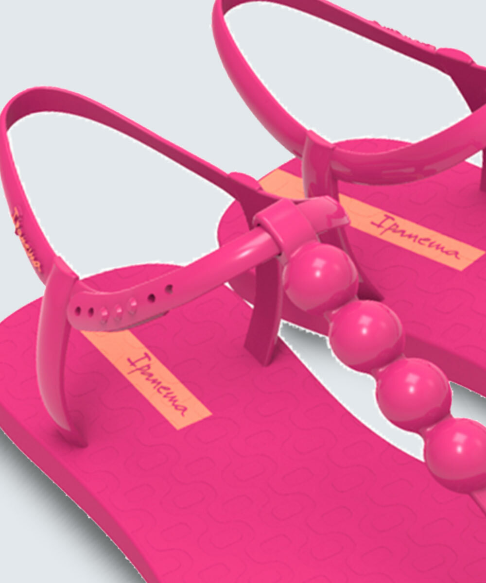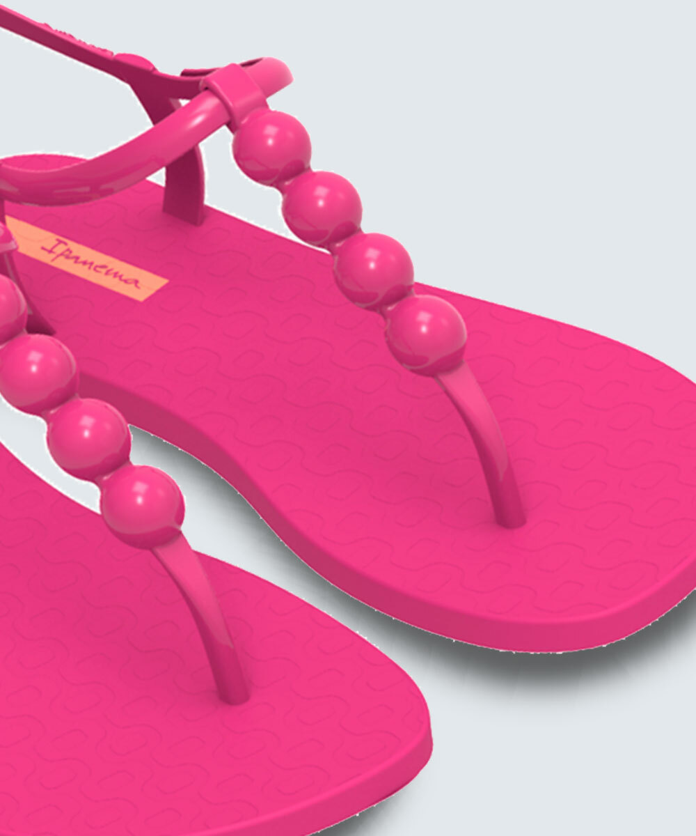 Sandália feminina rasteira, confeccionada em PVC, tiras de dedo com aviamentos decorativos e fechamento por pinos de encaixe.