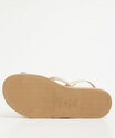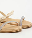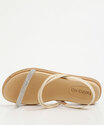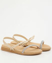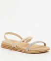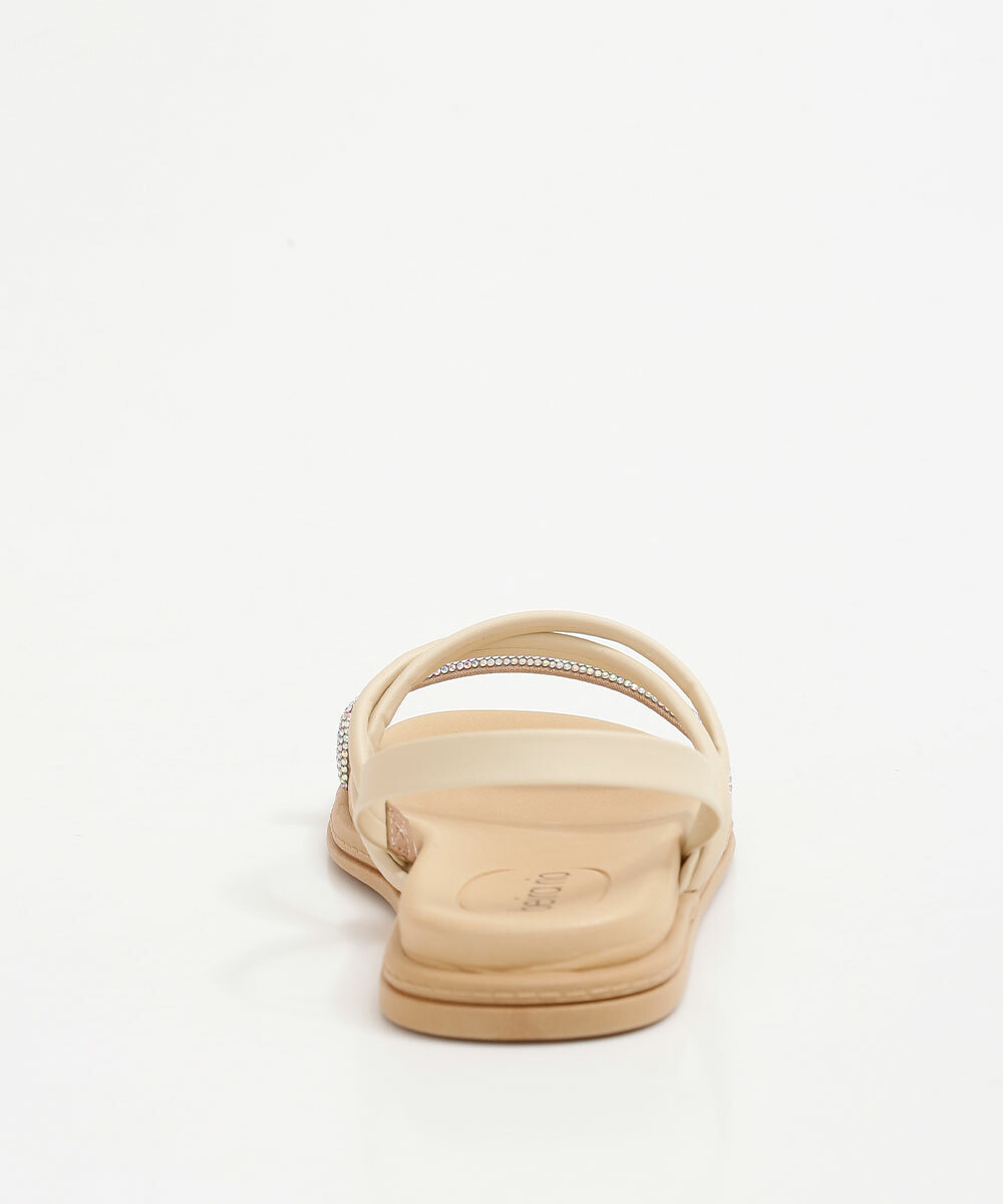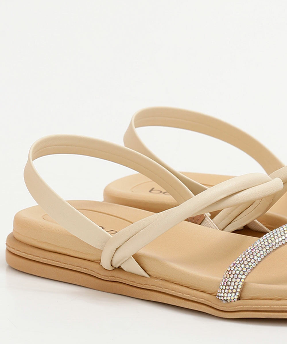 Sandália feminina rasteira, confeccionada em material sintético, tiras no cabedal com strass, tira no calcanhar.