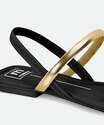 Sandália feminina rasteira, confeccionada em material sintético, tiras no cabedal e fechamento por tira elástica.