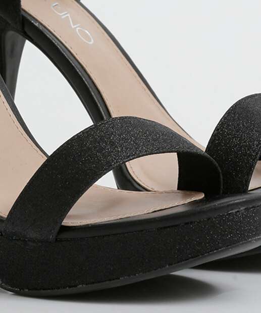 Sandália feminina, confeccionada em material sintético com aplicação de brilho, salto alto fino meia pata e fechamento por fivela.