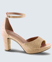 Sandália feminina, confeccionada em material sintético com aplicação de brilho, salto alto grosso meia pata e fechamento por fivela.