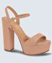 Sandália feminina, confeccionada em material sintético, salto alto grosso meia pata e fechamento por fivela.
