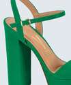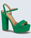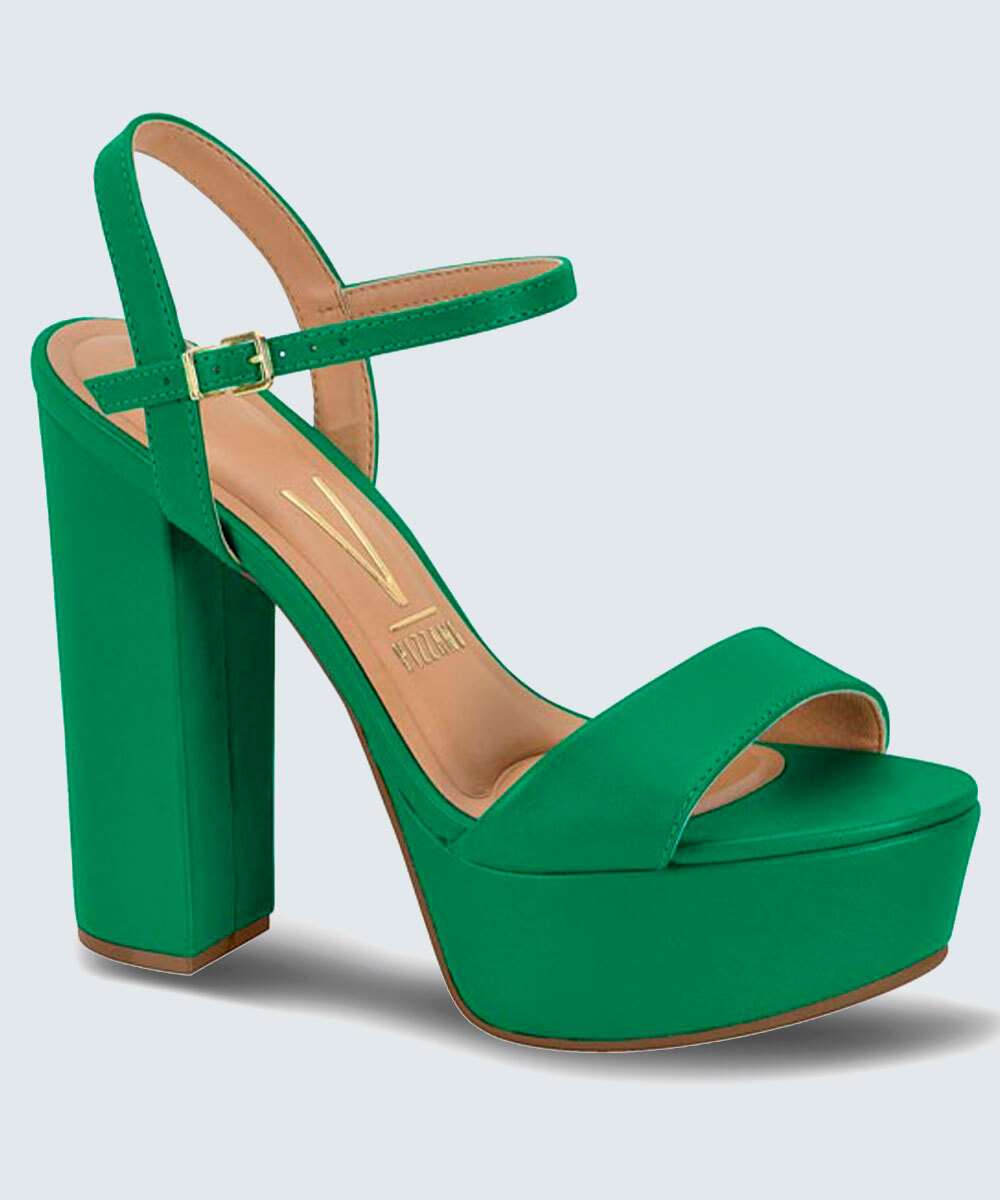 Sandália feminina, confeccionada em material sintético, salto alto grosso meia pata e fechamento por fivela.
